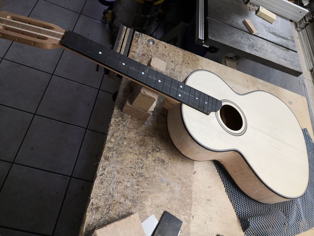 Νάσο μάλλον εννοείς αν έχω κάνεi καμπύλωση στην ταστιέρα. Συνήθως στις ακουστικές κιθάρες κάνω καμπύλωση με ακτίνα 16". Σε αυτό το κιθαρόνι είχα πει αρχικά να μην κάνω καμπύλωση αλλά τελικά όταν κόλλησα την ταστιέρα αποφάσισα να κάνω μια πιο ελαφριά καμπύλωση και έτσι την έκανα με ακτίνα καμπυλότητας 20" (στην ουσία έχω ένα τάκο που από την μια μεριά είναι 16" και από την άλλη 20").