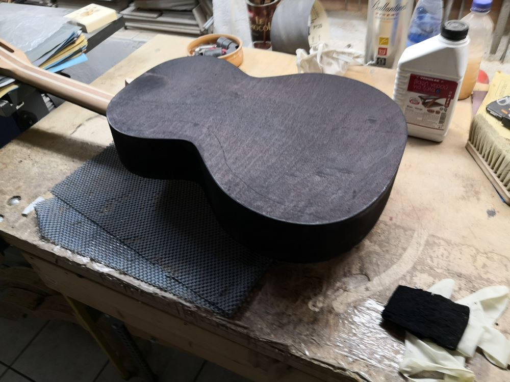 Οι φωτογραφίες πολλές φορές λένε ψέματα ή δεν λένε όληλ την αλήθεια. Εν πάσει περιπτώσει δεν λέω ότι το αποτέλεσμα είναι χάλια. Απλώς δεν ανταποκρίνεται σε αυτό που εγώ περιμένω κάθε φορά. Το μεγαλύτερο πρόβλημα είναι ότι το χρώμα εμποτισμού (νερού) που χρησιμοποίησα για το βάψιμο με το ελαφρότερο τρίψιμο έφευγε και έτσι έγιναν διάφορα μπαλώματα. Υπήρχαν πολλά περισσότερα αλλά έκανα διάφορα μέχρι να το φέρω σε λογαριασμό. Βέβαια αυτό που τελικά μετράει είναι τι ήχο θα βγάλει. Θα το μάθουμε σύντομα. :o