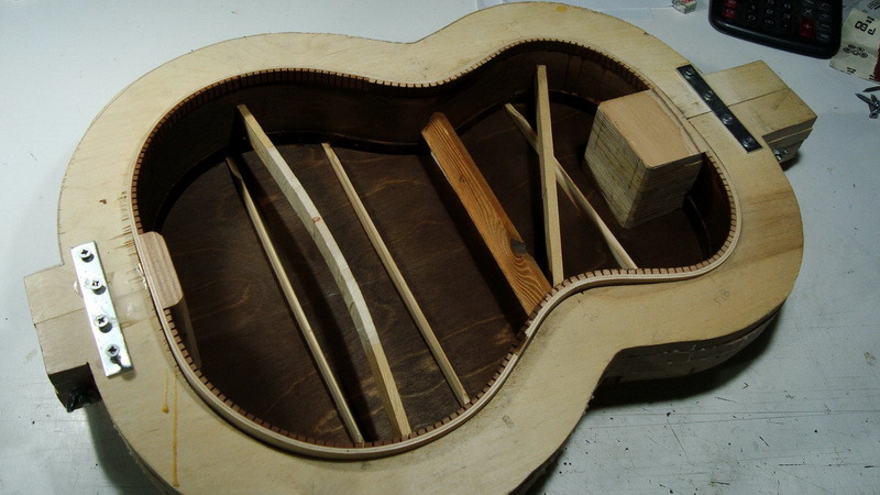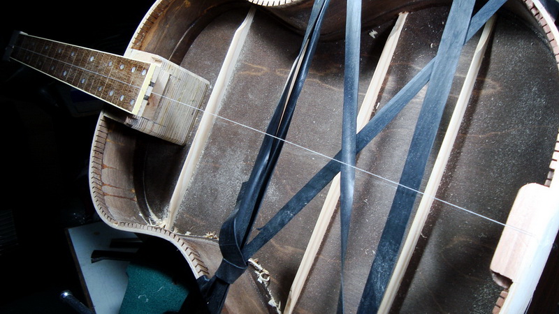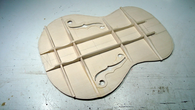 Εδώ να πω δυο λόγια για τις βασικές επιλογές: γενικά γίνονται και με X και με παράλληλα καμάρια, αλλά πιο διαδεδομένα είναι τα παράλληλα (με μια ελαφριά γωνία σ΄ αυτό από την πλευρά των μπάσων). Στις archtop , ειδικά αν είναι σκαλισμένα, μπορεί να υπάρχουν μόνο τα διαμήκη. Στις flat top όμως χωρίς εγκάρσια (ή Χ) δεν μπορείς να δώσεις διπλή καμπυλότητα εκτός κι αν χρησιμοποιήσεις καλούπι και για το καπάκι, πράγμα που δεν κάνω εγώ.