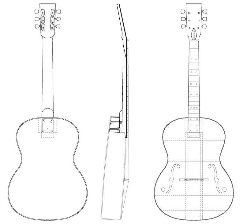 Το σχήμα του σκάφους έχει επίσης διαφορές από τα επικρατούντα πλέον σχήματα κιθαρών με f holes (πιο μεγάλη καμπάνα και πιο στενή μέση). Θα μοιάζει όμως πιο πολύ στις πρώτες flat top (με επίπεδο καπάκι, εδώ μια του 1936)