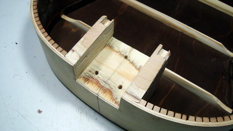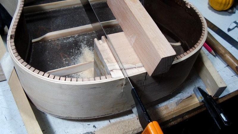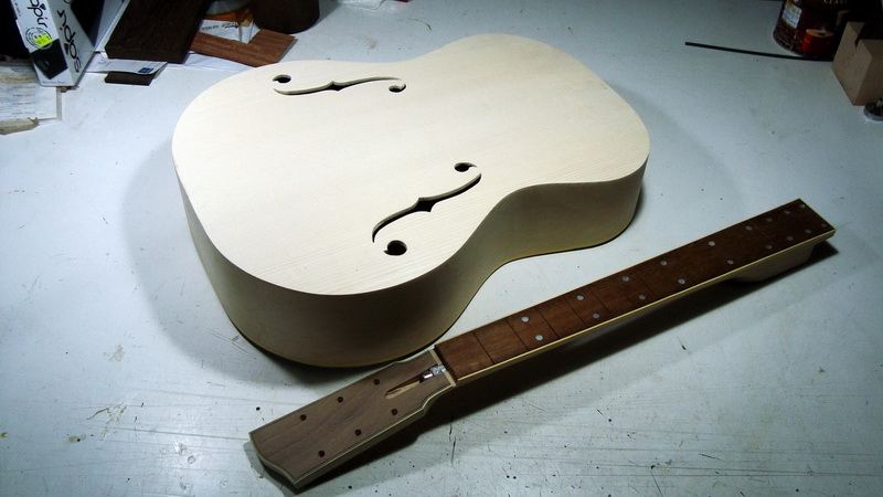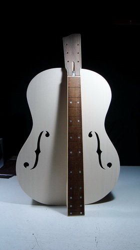 Μέχρι που τον περασμένο μήνα χρειάστηκα το καλούπι. Όμως δεν ήθελα να βγάλω από μέσα τα πλαϊνά με κίνδυνο να αχρηστευθούν - ή να τα στοιβάξω για "μελλοντικά σχέδια" και τελικά απλά να τα πετάξω. Και αφού στην resonator θα έκανα και πάλι f holes που μ' αρέσουν (στην πάνω καμπάνα), λέω "ε, δεν κάνεις και μια "κανονική" f holes να την βλέπεις να χαίρεσαι"? (πολύ μ΄αρέσουν οι f holes)