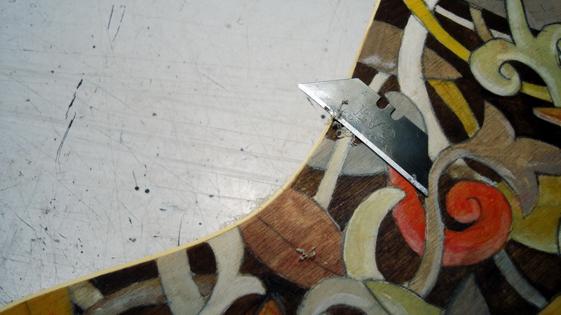 Δεν ήθελα να μπλέξω ΚΑΙ με σκάλισμα καπακιού (μου αρκεί η Λάρισα, μην ανέβω και τον Όλυμπο) οπότε απόφάσισα να κάνω απλώς μια πιο έντονη καμπύλη στο καπάκι. Xρησιμοποίησα το radius disk που κάνω συνήθως στην πλάτη, κι έτσι καπάκι και πλάτη θα έχουν ίδια καμπυλότητα (R ~ 15 ft). Έβαψα κι από μέσα την πλάτη, μιας και θα βαφεί κι απέξω η κιθάρα.