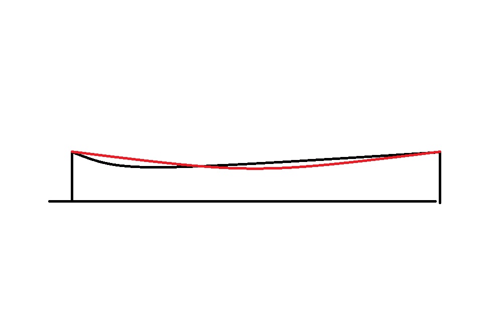 Στο παρακάτω πολύ-πολύ χονδρικό σκιτσάκι, η κόκκινη γραμμή είναι η επιθυμητή καμπύλη του truss rod. Όμως στην περίπτωσή σου Μάνο φαίνεται ότι το μπράτσο λυγίζει σύμφωνα με τη μαύρη γραμμή. Ποιές είναι οι πιθανότητες; Πέρα από την περίπτωση χαλασμένου truss rod (μάλλον δύσκολο), η πιό πιθανή εκδοχή είναι ότι το μπράτσο αντιστέκεται στο να λυγίσει όπως πρέπει και επιτρέπει μόνο να λυγίζει στα πρώτα τάστα που συνήθως είναι πιό λεπτό.