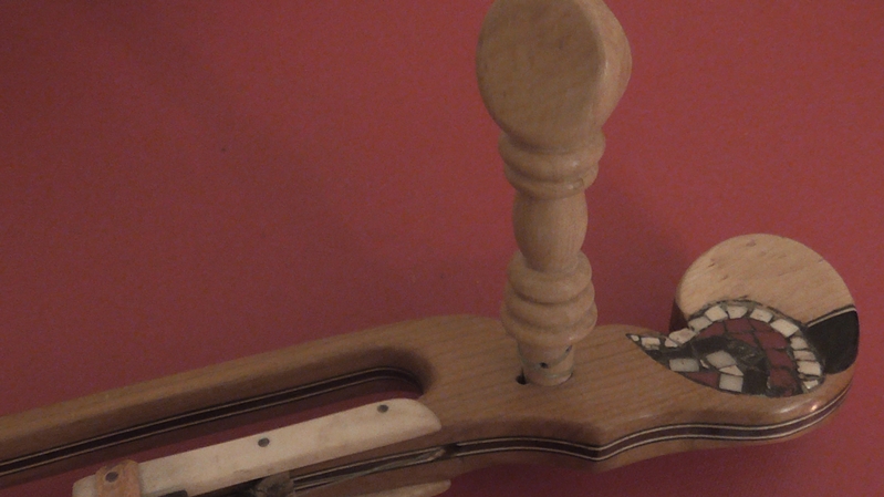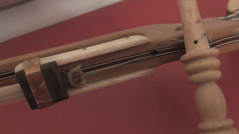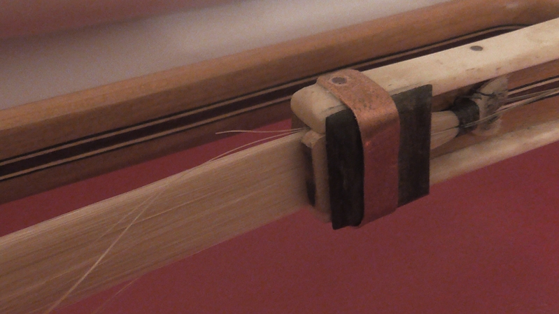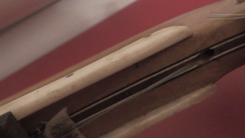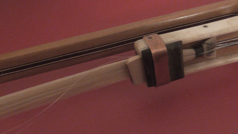 Στήν μεριά πού τό κρατᾶμε τώρα , θέλουμε ν' ἁπλώσουν οἱ τρίχες . Γι' αὐτό εἰσάγουμε μιά λεπτή σφήνα μεταξύ τῶν τριχῶν καί τοῦ πλακιδίου ἀπό μαῦρο ξῦλο ( ἔβενος ) πού συγκρατεῖται μέ τό χάλκινο ἔλασμα :