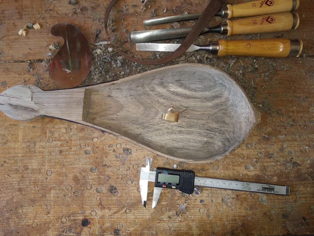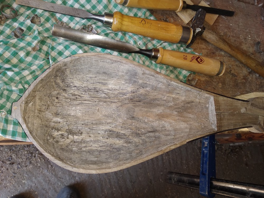 Για το καπάκι κολλησα δυο κομμάτια κυπαρίσσι παχους περιπου 1,5 cm , οπως κανουμε στα άλλα εγχορδα και το διαμορφωσα απο κατω μετα, ετσι ωστε να εφάπτεται ακριβώς στην καμπυλη επιφάνεια του σκαφους . Μετα αρχισα να το τρωω απο πανω μεχρι να πετύχω 5mm στο κέντρο και 2.5mm στις ακρες