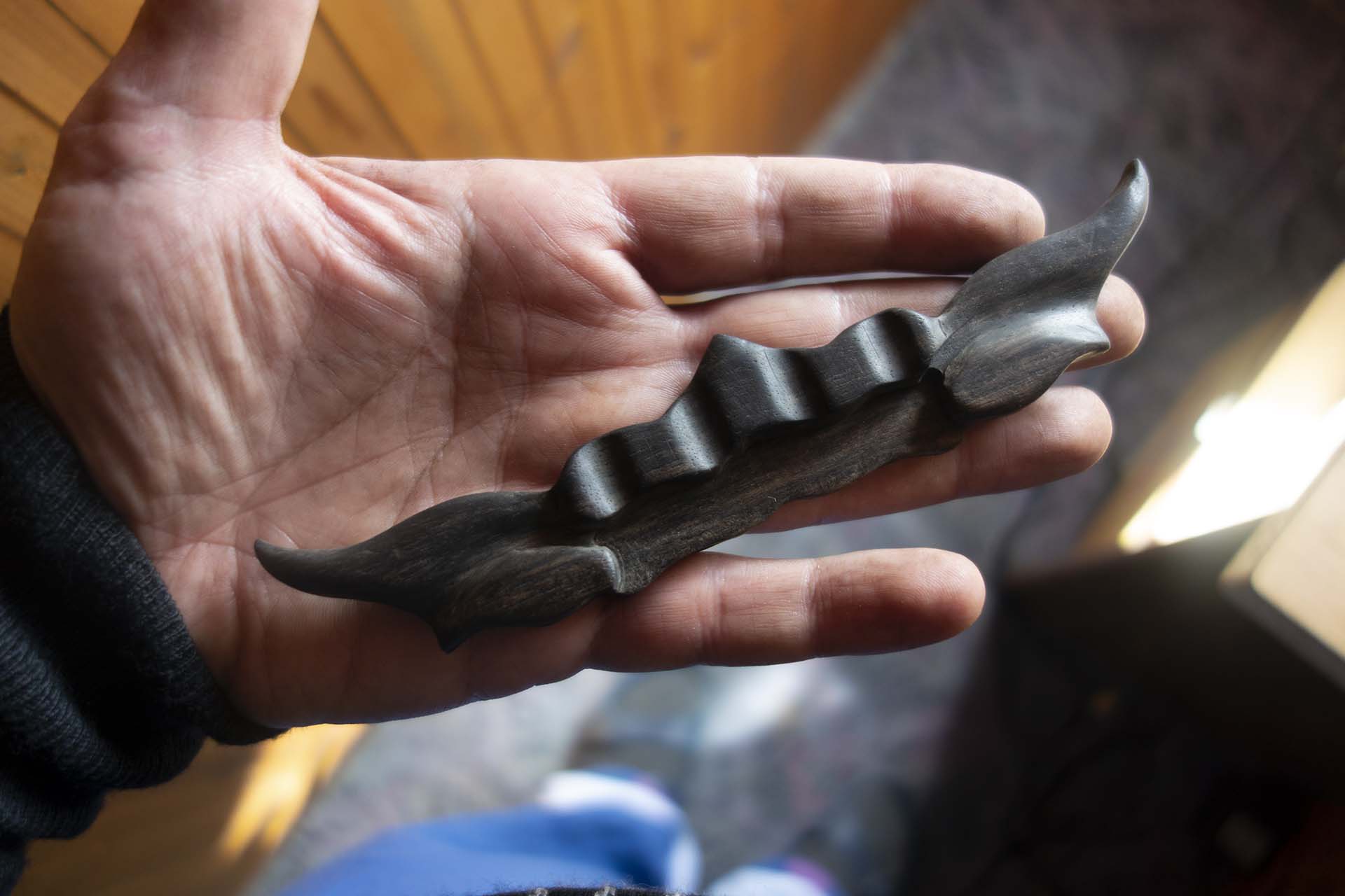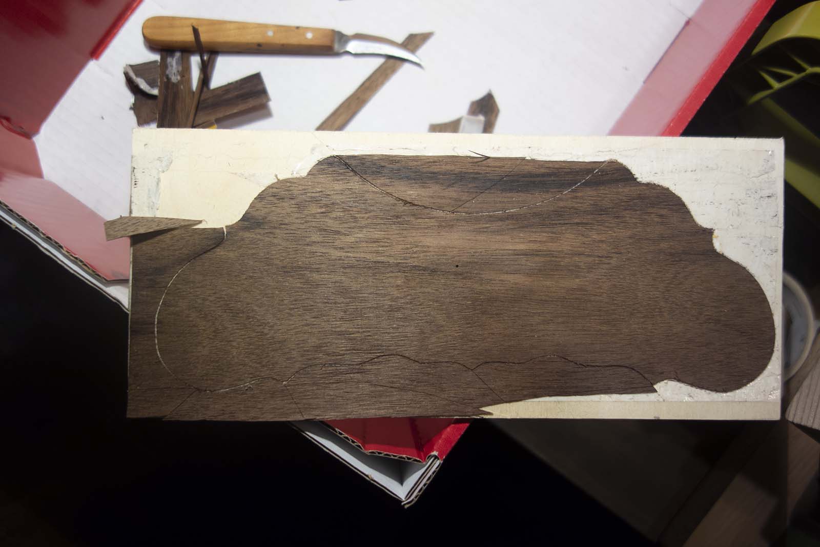 Το έφαγα περίπου μισώ χιλιοστό όποτε το σχήμα που βλέπεται απο τα ρινίσματα του ξύλου έχει μόλις μισό χιλιοστό πάχος κατά το τελικό τρίψιμο λόγο του μικρού πάχους αποκολλήθηκε ένα κομμάτι σε δυο σημεία και έπρεπε να το ξανά έφτιαχνα, τώρα ξέρω πως αν κάνω τέτοια δουλειά θα αφήσω ψωμί για τρίψιμο.