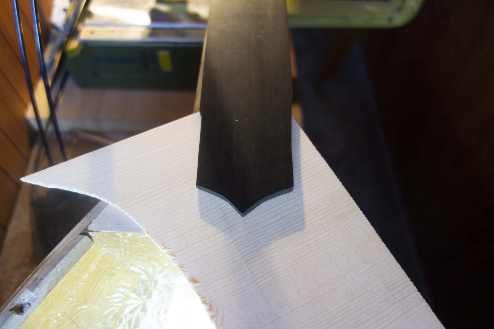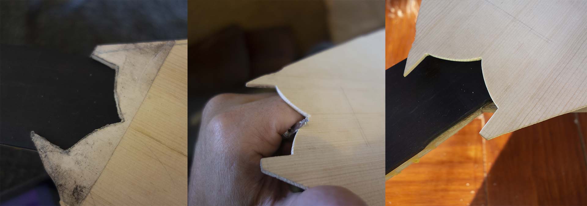 Όσο στέγνωνε ο καβαλάρης περίλαβα την ταστιέρα αποφασίσαμε για το παρακάτω σχήμα το οποίο δεν ήταν δύσκολο να γίνει. Το επόμενο βήμα ήταν το κόλλημα της ταστιέρας στο μανίκι ξυλόκολλα titebond. Να αναφέρω εδώ πως η ταστιέρα είχε τριφτή πολλή πιο μπροστά οπότε το πάχος ήταν είδη διαμορφωμένο.