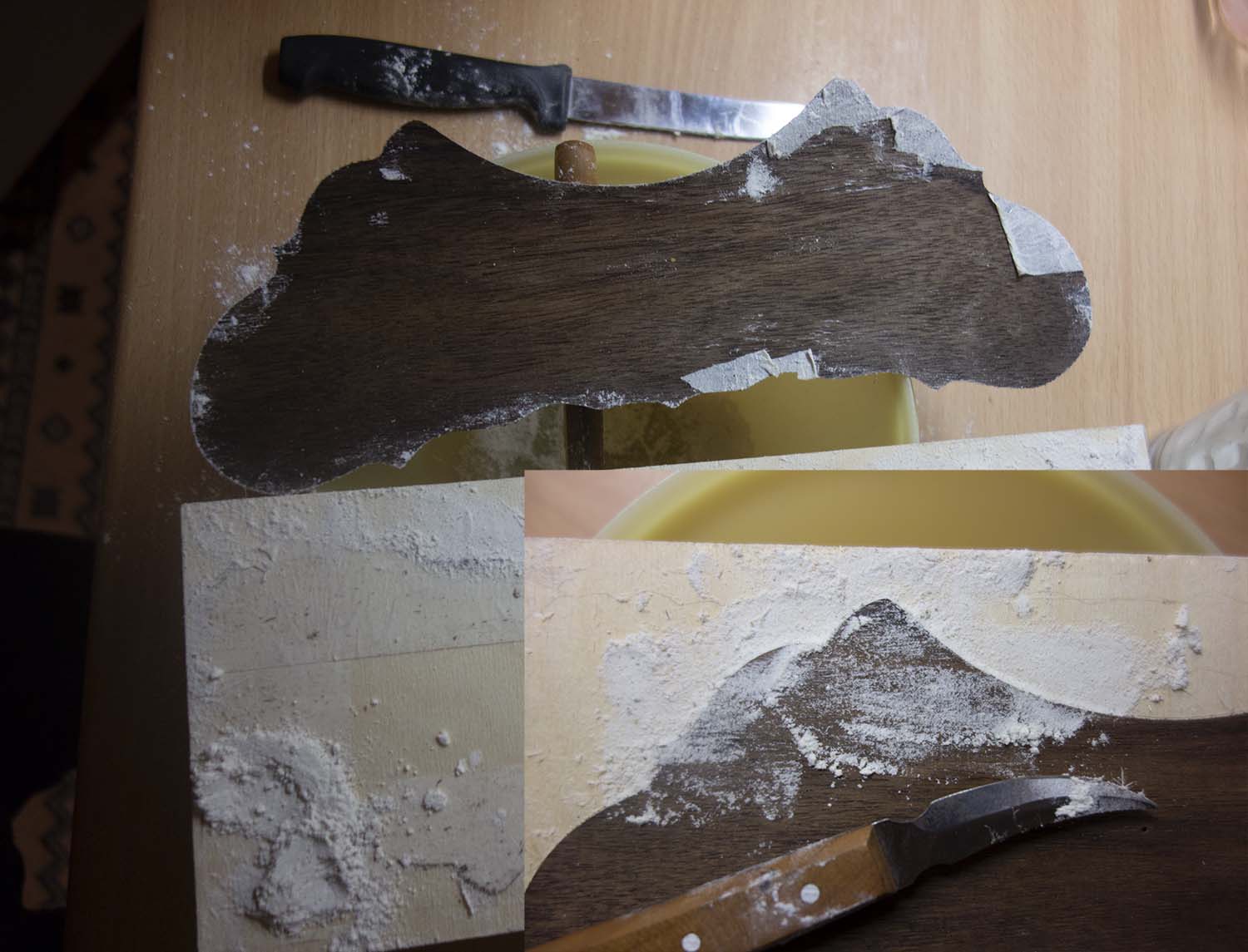 Μετά άρχισε το γέμισμα απο σκόνη τηρημένου ξύλου και κολλημένο με κόλλα στιγμής.