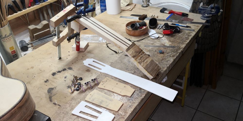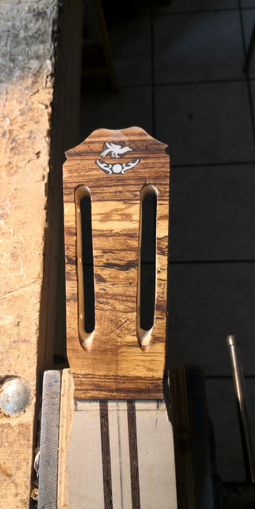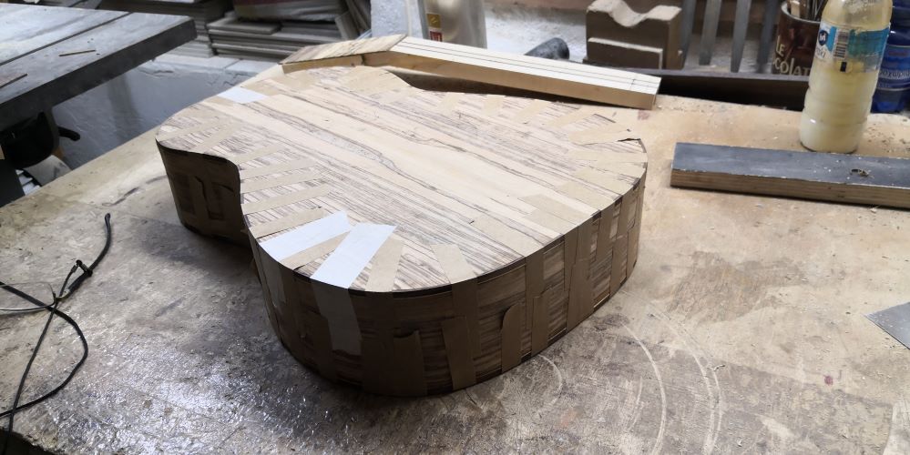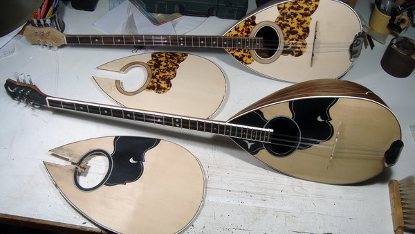 Εδώ έχουμε ένα όργανο που φτιάχνουμε με ένα φίλο μάστορα και καλλιτέχνη με άποψη. Επιμένει να κάνει όλες τις δουλειές στο γόνατο, με μία ράσπα, μία λίμα, σφικτήρες, γυαλόχαρτο , κόλλα και ταστοπρίονο. Οι μεθόδοι του είναι ανορθόδοξες αλλά έχει βγάλει ωραία όργανα.