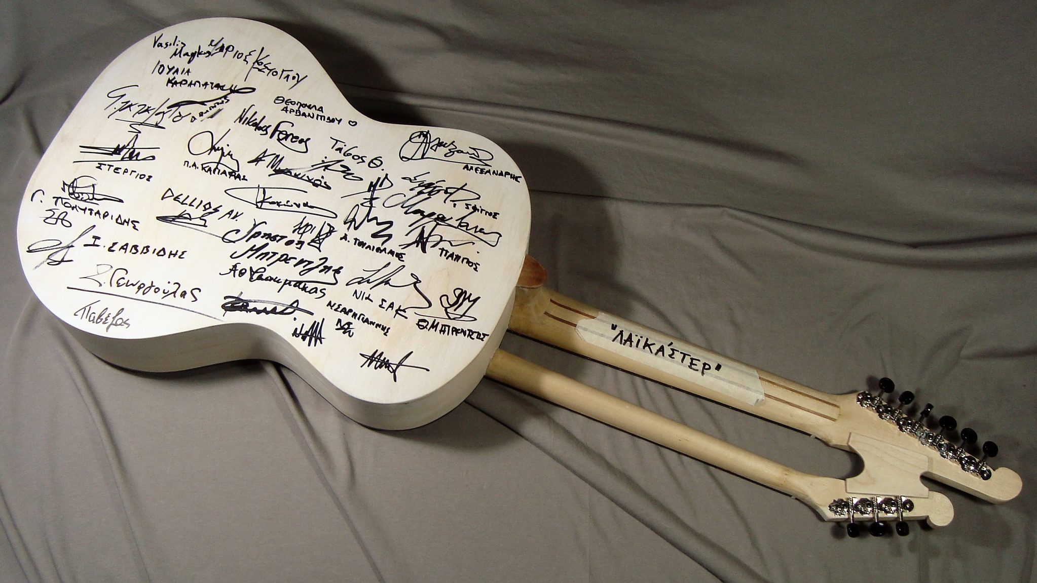 αμέσως μετά, ήρθε κι άλλη έμπνευση: αφού δεν είχα βερνικώσει (ούτε καν αποφασίσει αν θα την αφήσω έτσι) το σκάφος της, είπα να συλλέξω υπογραφές από τους παριστάμενους οργανοποιούς και σημαντικούς (όσους ήξερα κι είχα το θάρρος) επισκέπτες και συντελεστές. Έτσι έχει υπογραφές από Κοκκώνη, Ιφ. Ιωάννου, Πάππο, Ιουλ. Καραπατάκη κ.ά. Θα βερνικωθεί (για προστασία) και θα πάει ως δώρο και αναμνηστικό στην Πριγκηπέσσα, που είναι το "δεύτερο σπίτι" του φεστιβάλ (όπως και το 2014).