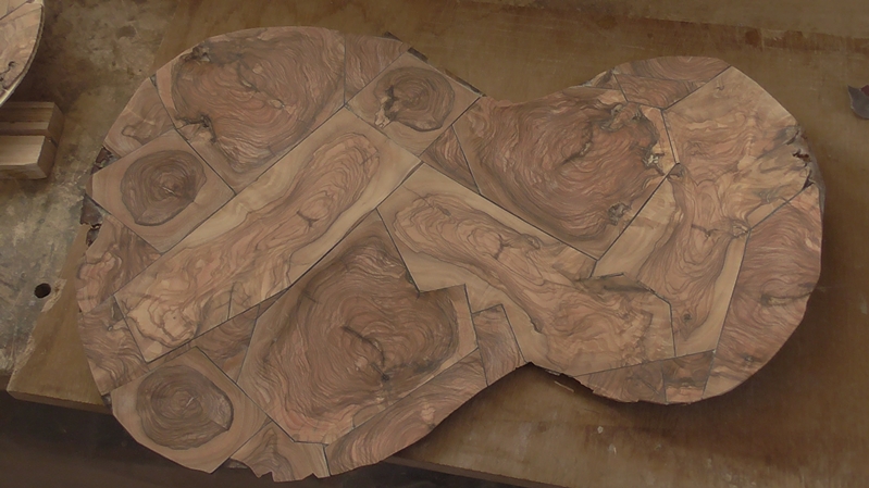 Τό πρόβλημα ἦταν πῶς θά στερεώνονταν αὐτά τά μικρά κομμάτια τῆς ἐλιᾶς , ὥστα νά δώσουν μιά ἑνιαία καί λεπτή ἐπιφάνεια . Φυσικά , ἡ πρώτη σκέψη ἤταν ὅτι , ὅλ' αὐτά τά κομμάτια , ἀφοῦ κοποῦν λεπτά στό κάθετο δισκοπρίονο , ταιριαστοῦν μεταξύ τους καί συναρμολογηθοῦν μέ χαρτοταινία , νά κολληθοῦν σέ μιά λεπτή ἑνιαία ἐπιφάνεια , φυσικά σέ καπλαμᾶ .