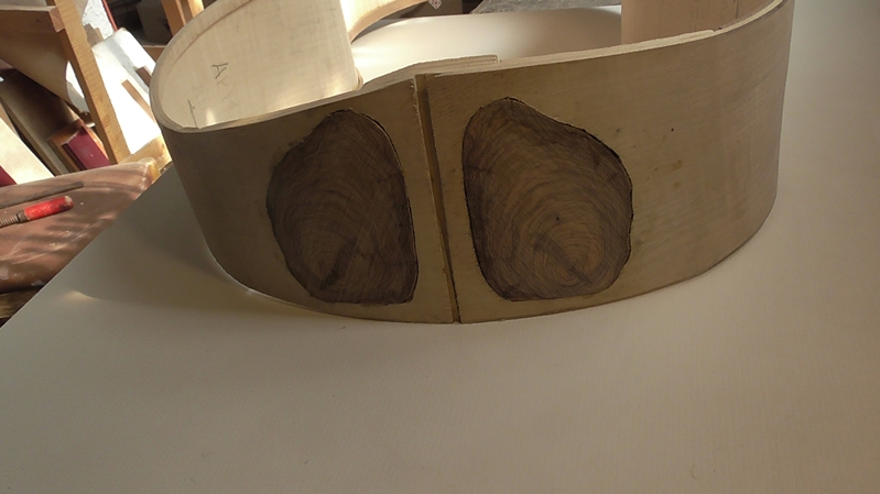 Στό πίσω μέρος τοῦ σκάφους ὅπου ἐνώνονται τά δύο πλαϊνά ( περιοχή κάτω τάκου ) , χώνεψα δύο φέτες ἐλιᾶς σόκορο κομμένες στά τέλη τῶν σφενδαμένιων πλαϊνῶν , σάν στολίδι , ἀντί γιά τίς τραπεζοειδεῖς ξύλινες πλάκες διαφορετικοῦ χρώματος πού ἐνθέτουν στήν ἔνωση , ἀφοῦ σχηματιστῆ τό ὄργανο . Αὐτό τό ἔκανα πρίν ἀκόμη ἐνώσω τά πλαϊνά μέ τό μάνικο , ὅταν αὐτά ἦταν ἁπλῶς λυγισμένα ἀφαιρῶντας τό ξῦλο τοῦ σφενδαμιοῦ μέ τό πριονάκι . Τό πίσω μέρος τῶν πλαϊνῶν τό κάλυψα κολλῶντας το ἀπ' τή μέσα μεριά μέ μιά μακρυά φέτα σφενδάμι καί φαρδιά ὅσο τά πλαϊνά γιά νά πατήσουν οἱ φέτες τῆς ἐλιᾶς :
