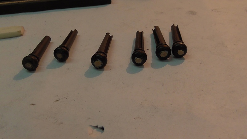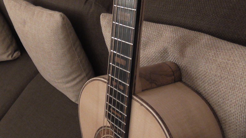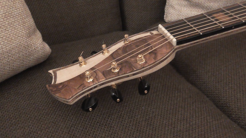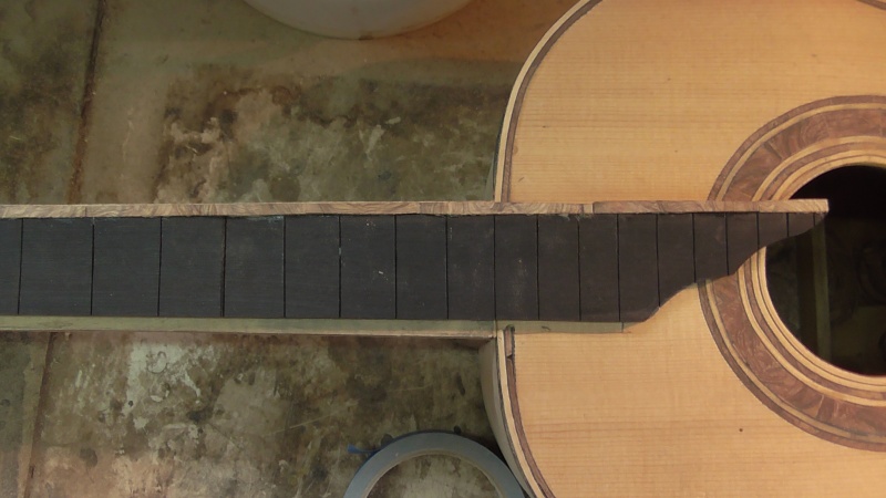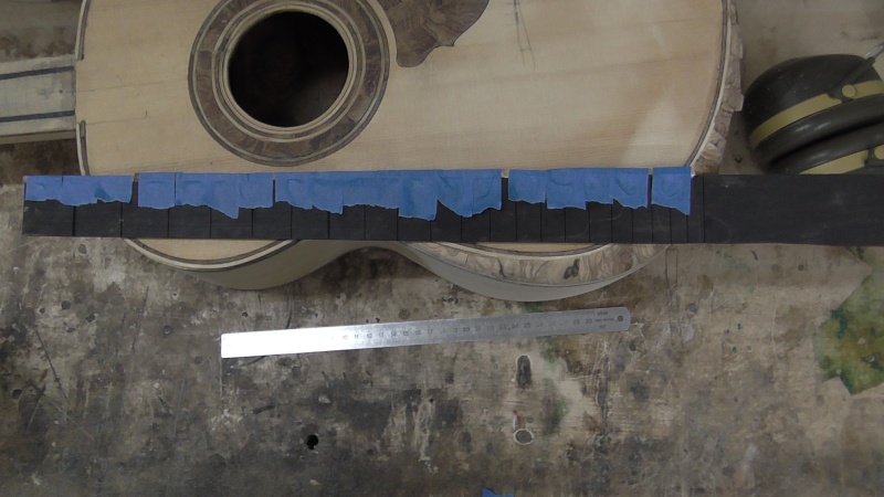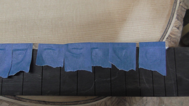 Σήμερα τό πρωϊ ἔτριψα πάλι τήν ταστιέρα μέχρι γυαλόχαρτο 5000 ( τόν ἔβενο ) πού εἶχε γίνει χάλια , καί τήν λάδωσα , πέρασα ὅλη τήν κιθάρα μέ τήν ἀλοιφή Black Bison , πού δέν τήν γυάλισε καί ἰδιαίτερα νά πῶ τήν ἀλήθεια , παρ' ὅλο πού τήν ἔτριψα μέ μάλλινη ἐπιφάνεια - ἐξάρτημα ἔκκεντρου τριβείου μέ velcro ) , ἄνοιξα τίς τρῦπες στόν καβαλλάρη γιά τούς πείρους συγκρατήσεως τῶν χορδῶν , χάραξα τόν ἄνω καβαλ-λάρη σύμφωνα μέ τό σχέδιο τοῦ βιβλίου καί τόν τοποθέτησα χωρίς νά τόν κολλήσω ( ἔγινε λίγο ὑψηλός γιατί δέν χρησιμοποίησα μισομόλυβο , ἀλλά θά τόν κατεβάσω ) , τοποθέτησα τά κλειδιά στίς ἕτοιμες τρῦπες πού εἶχα ἀνοίξει καί τελικά πέρασα τίς χορδές , κάτι παλιές ἀπό τίς προηγούμενς κιθάρες , πού τίς κρατῶ γιά δοκιμαστικές , ὥσπου νά τραβήξη γιά μερικές ἡμέρες , καί μετά θά περάσω τίς κανονικές .
