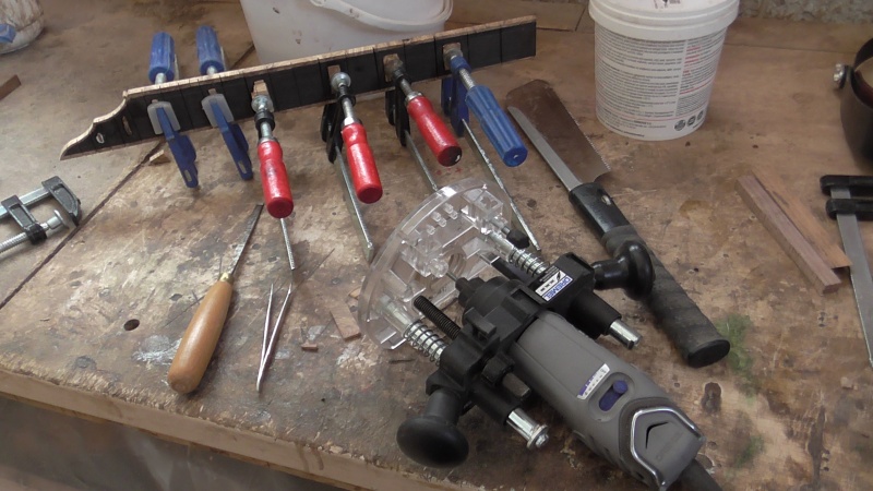 Τέρμα καί ἡ ταστιέρα , σήμερα τό πρωϊ απ' τίς 6.00 δουλεύω . Μάλιστα μεταποίησα καί μιά λαμαρινοτανάλια στό γνωστό ἐργαλεῖο πιέσεως τῶν τῶν σιδερακίων τῶν τάστων στίς αὐλακιές τῆς ταστιέρας :