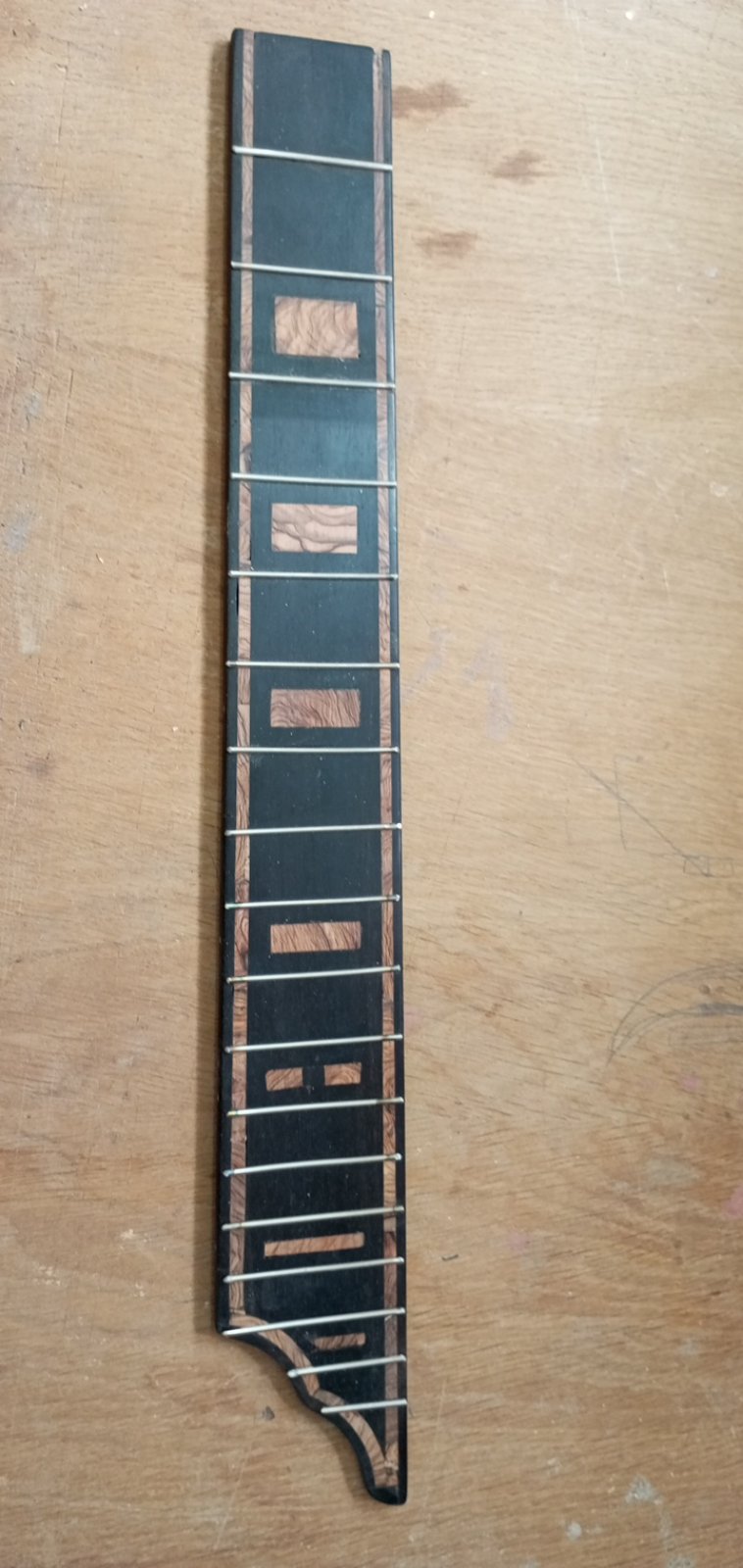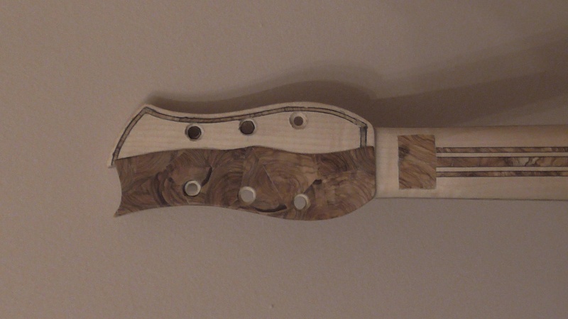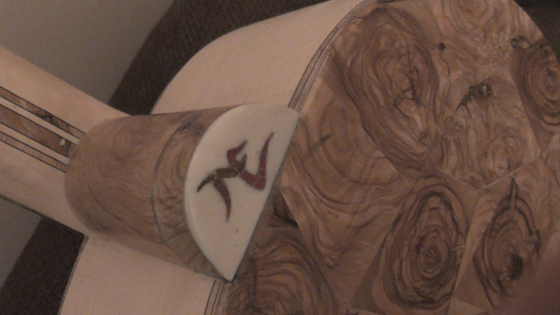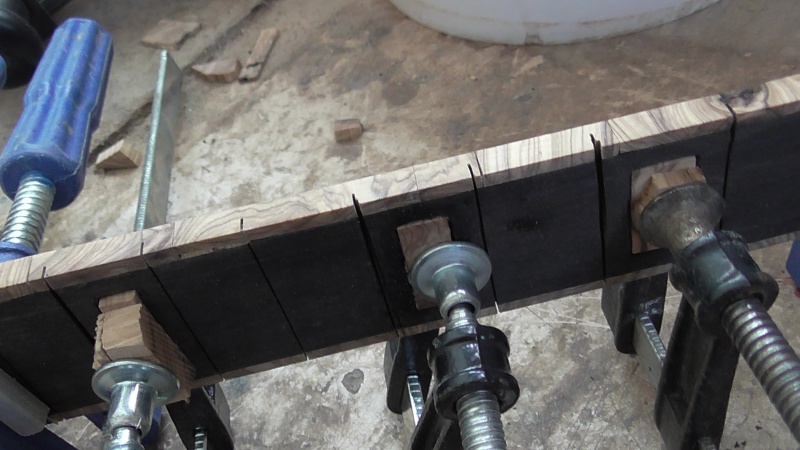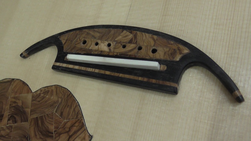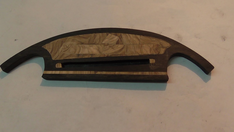 Ἀφοῦ , ὅταν εἶχε ἀκόμη παραλληλεπίπεδο σχῆμα , ἔσκαψα μέ τόν ταχυτροχό , σύμφωνα μέ τίς ὁδηγίες τοῦ βιβλίου , λοξά τήν αὐλακιά γιά τό κόκκαλο , σκέφτηκα νά τόν διακοσμήσω μέ τεμάχια ξύλου ἐλιᾶς σόκορο , ὅπως τήν πεναριά . Ἔτσι ἔσκαψα ἕνα σκάμμα μέ τό ἴδιο ἐργαλεῖο σέ βάθος 2,5 χιλ. , καί ταίριαξα μέ κόλλα κομμάτια ἐλιᾶς . Στό μπροστινό μέρος , πρός τήν ροζέττα , κόλλησα μιά βέργα πάχους 2 χιλ. ἐλιᾶς καί ἀπό δίπλα μιά βέργα ἐβένου πάχους 3 χιλ. Ἔτσι , ἐνίσχυσα καί τήν περιοχή πού θά ζμπρώνει τό κόκκαλο πιεζόμενο ἀπό τίς χορδές πρός τήν ροζέττα , " διά πᾶν ἐνδεχόμενον "........στό δεξιό καί ἀριστερό μέρος τῆς αὐλακιᾶς κόλλησα 2 κομματάκια ἐλιᾶς , γιατί τό κόκκαλο ἦταν λίγο ἐλλατωματικό στίς ἄκρες . Μίκρυνε λίγο , ἀπό 8 ἑκ. σέ 7 , ἀλλά δέν θά ἐπηρεάση τήν κατάσταση .