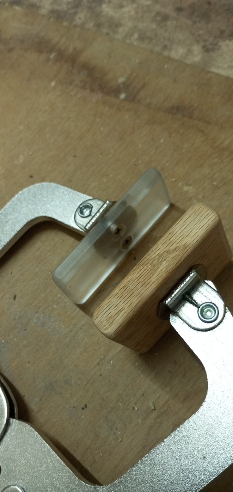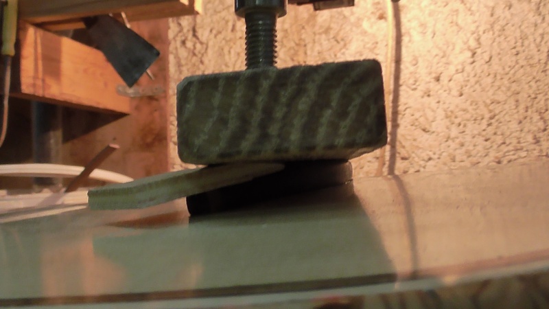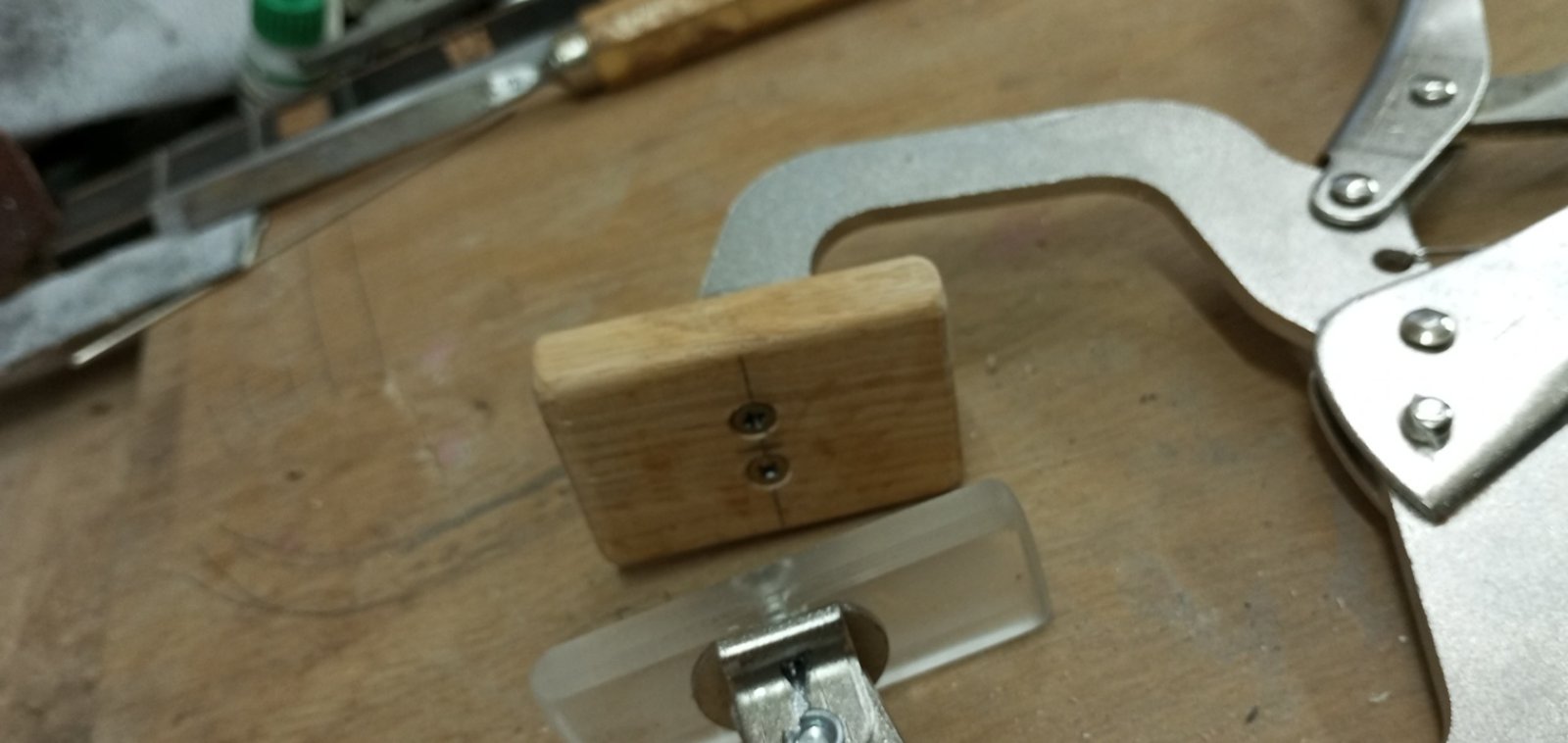 Γιά τό κόλλημα τῶν " μουστακιῶν " ἄνοιξα 2 τρῦπες πιό ἔξω στόν τάκο καί ἐφάρμοσα μέ μοῦφες αὐτές τίς 2 βίδες μέ βίδωμα allen , καί μ' αὐτές λογάριαζα νά πίεζα τίς λεπτές προεκτάσεις τοῦ καβαλλάρη , πού ἀπεῖχαν 1 χιλ. στήν ἄκρη γιά νά πατήσουν στό καπάκι , γιατί δέν ἔτριψα τό κάτω μέρος τοῦ καβαλλάρη στό καπάκι ὅσο ἔπρεπε - βαρέθηκα . Τελικά δέν χρησιμοποίησα αὐτές τίς βίδες , ἀλλά 2 ἁπλές σφῆνες ἀπό λεπτό κόντρα πλακέ γιά νά " πειθαναγκάσω " ( ἀκοῦς Στέργιε ; ) τίς 2 λεπτές προεκτάσεις νά κολλήσουν κι αὐτές .
