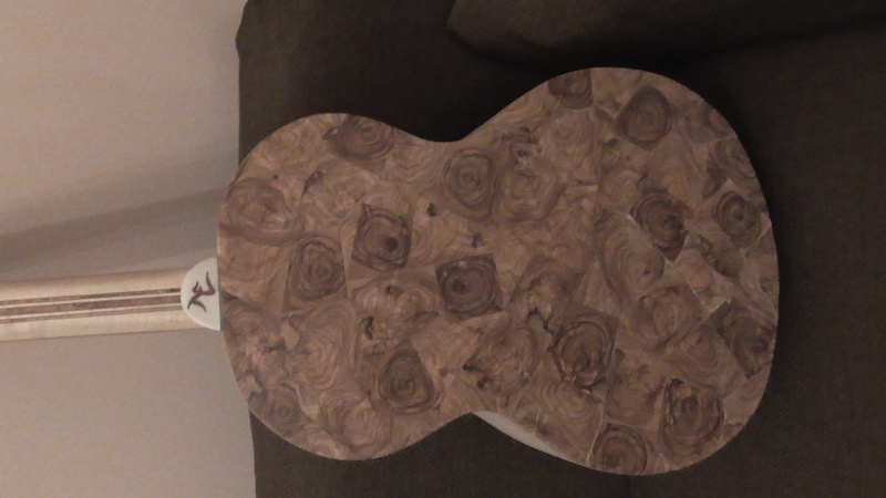 καί ἀκριβῶς αὐτό , δηλαδή λεπτές φέτες κομμένες στό κάθετο δισκοπρίονο ἀπό λεπτούς κορμούς ἤ χοντρούς κλώνους ἀπ' αὐτό τό δένδρο σκέφθηκα νά χρησιμοποιἠσω γιά τήν διακόσμηση καί ὄχι μόνο , αὐτῆς τῆς τρίτης κιθάρας πού ἀποφάσισα νά κατασκευάσω , καί τήν ὁποία σχεδιάζω ἐδῶ καί ἑνάμισυ χρόνο . Καί ἄργησα ἀρκετά νά παρουσιάσω τήν κατασκευή , πού τώρα πού γράφω ἔχω ἀρκετά προχωρήσει , διότι ἦταν κ΄'ατι νέο καί δέν ἤξερα ἄν θά πετύχη , καί δέν ἤθελα νά σᾶς ταλαιπωρήσω μέ κάτι πού μπορεῖ νά ἀπτύχαινε .