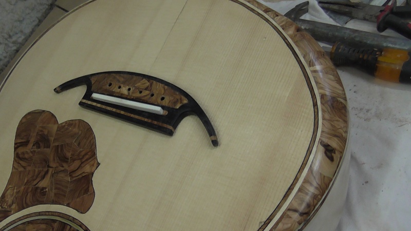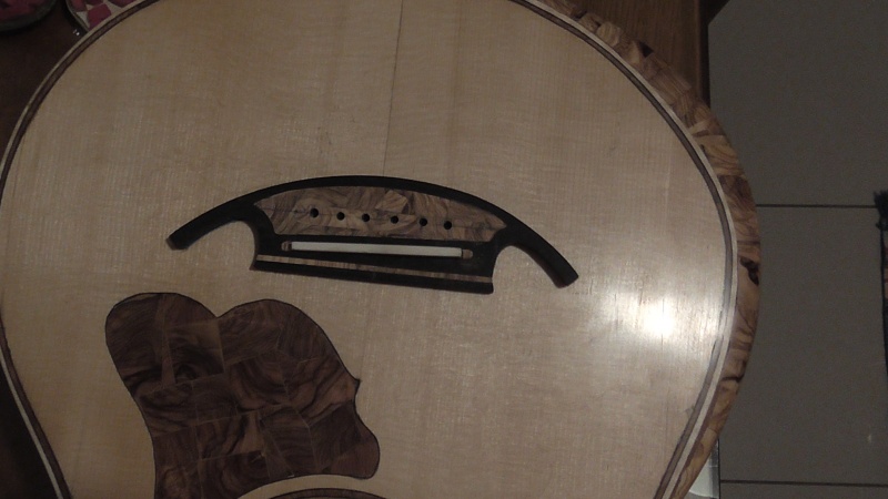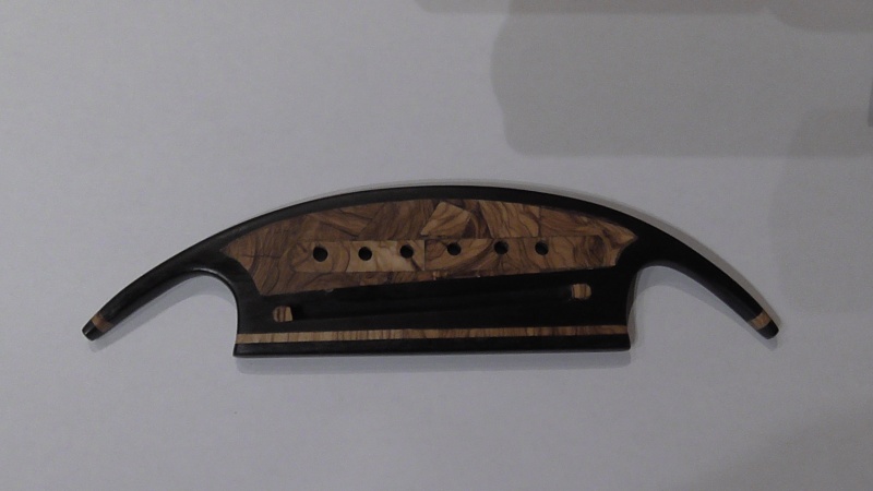 Ἀφοῦ τελείωσα τήν διαδικασία βερνικώματος μέ τήν γομαλάκα ( χωρίς νά λείψη καί ἡ περιπέτεια πού μέ ἀνάγκασε , μετά ἀπό ἀρκετές συνεδρίες βερνικώματος νά τρίψω ὅλο τό ὄργανο καί φτοῦ κι ἀπό τήν ἄρχή , διότι εἶχαν δημιουργηθῆ ἐμφανῆ κυκλικά σημάδια ἀπ' τό παραφινέλαιο πού δέν μποροῦσα ν' ἀπαλείψω ) , κόλλησα τόν καβαλλάρη μέ ἕναν ἁπλό μακρόστενο τάκο πού ἔκοψα καί πλάνισα , ὅπως εἶδα σέ διάφορα ξενόγλωσσα βιντεάκια , πολύ εὐκολώτερη μέθοδος ἀπ' αὐτή τῶν σφικτήρων :