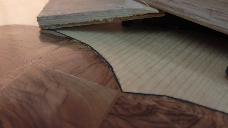 Στήν παραπάνω φωτογραφία φαίνεται ὅτι , ἀφοῦ ἀφαιρέθηκε τό κομμάτι τοῦ πλαϊνοῦ , κολλήθηκε πρῶτα ἕνα φιλέτο ἐλιᾶς καί ἐπάνω σ' αὐτό ἑνα φιλέτο σφενδάμι , γιά νά ξεχωρίζη τό πρῶτο ἀπό τήν λοξή ἐπιφάνεια πού θά εἶναι πάλι ἐλιά . Ἀκολούθησε ἡ διαδικασία κολλήματος τοῦ ξύλου ὑποστηρίξεως , τό καπάκωμα , καί τό φάγωμα μέ ράσπα τοῦ ξύλου ὑποστηρίξεως μαζί μέ τμῆμα τοῦ καπακιοῦ , γιά νά ἐπιτευχθῆ ἡ λοξή ἐπιφάνεια πού θά κολληθῆ ἡ ἐλιά . Παρακάτω ἡ ἀρχή τοῦ κολλήματος τῶν φετῶν τῆς ἐλιᾶς :