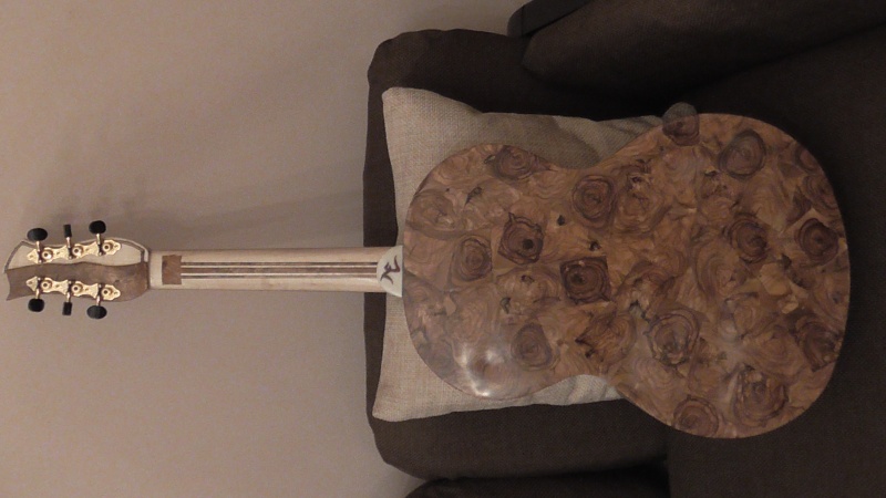 Τι θα εκανα στη θεση σου? Θα κολλουσα σε καπλαμα ( οπως κι εκανες) μια μονο πλευρα με ελιες, ,θα ετριβα στο τυμπανο στην πλευρα του ξυλου, και κατοπιν θα εδινα την επιθυμητη καμπηλη της πλατης με τα καμαρια.Αυτο που εκανες θα σου δωσει πολυ βαρος στην πλατη και τρομερη ακαμψια.Στον ηχο δεν ξερω τι θα κανει.......