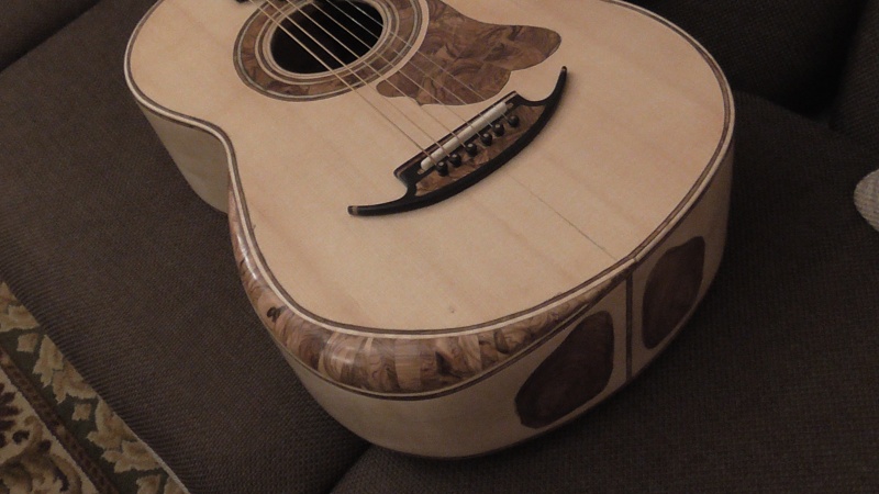 Αὐτά τά φιλέτα κολλήθηκαν στά πλαϊνά ἀφοῦ κολλήθηκε ἀπό τό μέσα μέρος αὐτῶν καί ἡ λωρίδα πού " παχαίνει " τά ἐπάνω μέρη τῶν πλαϊνῶν γιά νά " πατήσουν " καλύτερα πλάτη καί καπάκι . Αὐτήν τήν λωρίδα τήν κολλῶ μέσα ἀπ' τά πλαϊνά προτοῦ τά τρίψω γιά τήν δημιουργία θόλων ( ὑπολογίζοντας καί πόσο θά φύγη στό τρίψιμο ) , γιατί τό σφενδάμι μουαρέ , ἄν τό τρίψης σκέτο , χωρίς τήν ἀπό μέσα ἐνίσχυση , πετάει σκλέντζες . Ἔτσι , οἱ λωρίδες τῶν φιλέτων , κόλλησαν ἄνετα .