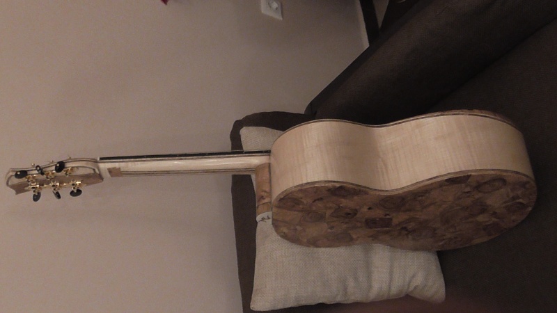 Ἡ ὅλη κατασκευή εἶχε σάν σχεδιασμό νά κατασκευαστῆ μιά λαϊκή κιθάρα ἀπό 2 κυρίως εἴδη ξϋλων : τό σφενδάμι μουαρέ καί τή ἐλιά ( ἐκτός βέβαια τοῦ ἐλατένιου καπακιοῦ καί τῆς ἐβένινης ταστιέρας ) . Γιά τό σφενδάμι πού θά γίνονταν τά πλαϊνά , χρησιμοποίησα ἔτοιμο καπλαμᾶ 3,2 χιλ. Ἐπίσης ἀπό συμπαγές σφενδάμι μουαρέ ἔγιναν τό μάνικο καί τό καράβολο . Τό κυρίως ζητούμενο ὅμως ἦταν , ἡ πλάτη νά κατασκευαστῆ ὁλόκληρη ἀπό μικρά κομμάτια ἐλιᾶς σόκορο κομμένης , καί μάλιστα μόνο ἀπό τό ἐγκάρδιο , καθόλου σομφό !!!`