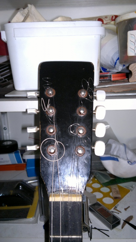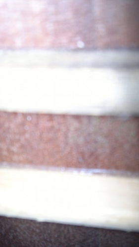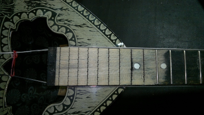 Εδώ το καράολο στο οποίο φαίνονται οι πίροι των κλειδιών να είναι μέσα σε φωλιές όπως σε κάποιες κιθάρες και τέλος το τμήμα της ταστιέρας που ξύστηκε ώστε να ευθυγραμιστεί και φαίνεται το ξύλο που πιστεύω ότι μάλλον είναι σάμπα.