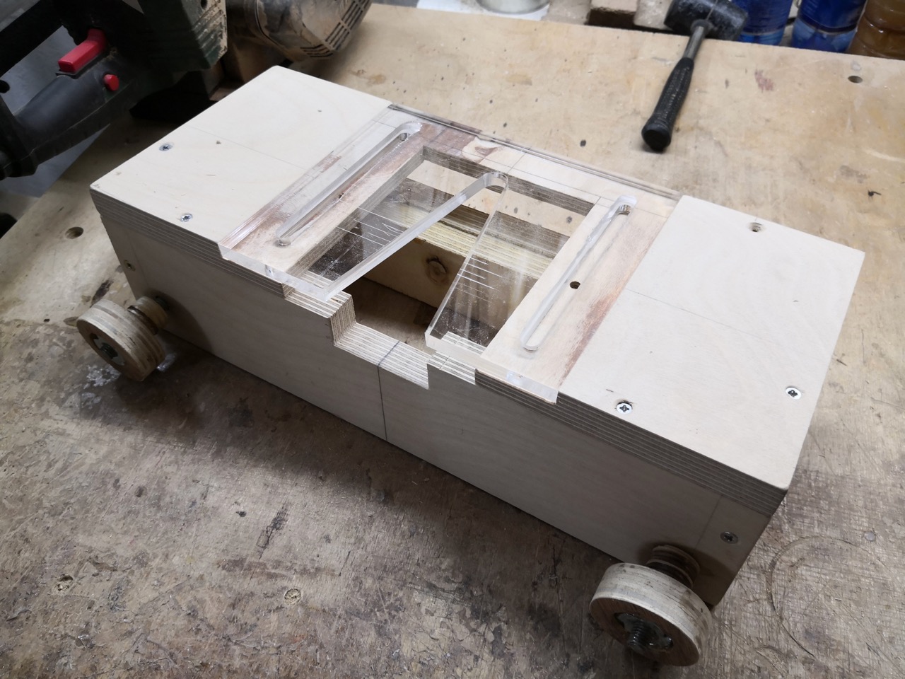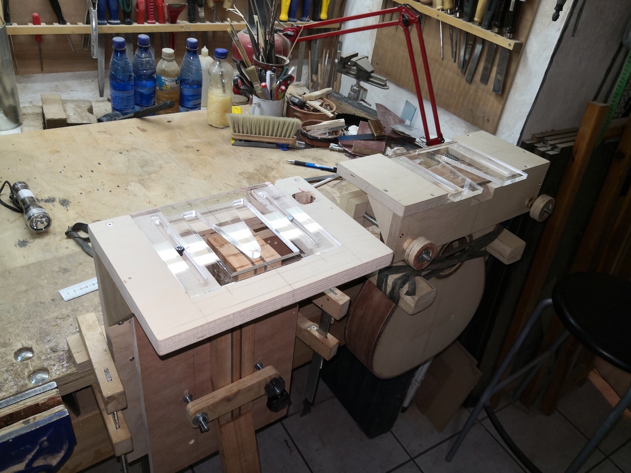 2) Ούτως ή άλλως η η ιδιοκατασκευή έπρεπε να "φορεθεί" πάνω στο σκάφος. Το ίδιο το σκάφος όμως δεν μπορούσε να σταθεροποιηθεί πολύ καλά, γιατί ο τρόπος που το έδενα στον πάγκο ήταν μάλλον πρωτόγονος (χρησιμοποιούσα τέσσερα ξύλινα σφιχρήρια και τελικά έπρεπε να βρίσκω επικίνδυνες ισορροπίες αφού αφενός δεν έπρεπε να το σφίξω πολύ (για να μην το καταστρέψω), ενώ από την άλλη η ιδιοκατασκευή ήταν βαριά και ήθελε καλό σφίξιμο για να μην "παίζει".  ::)