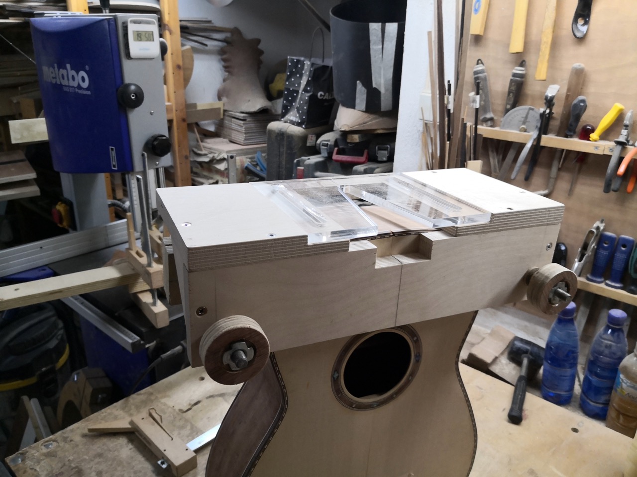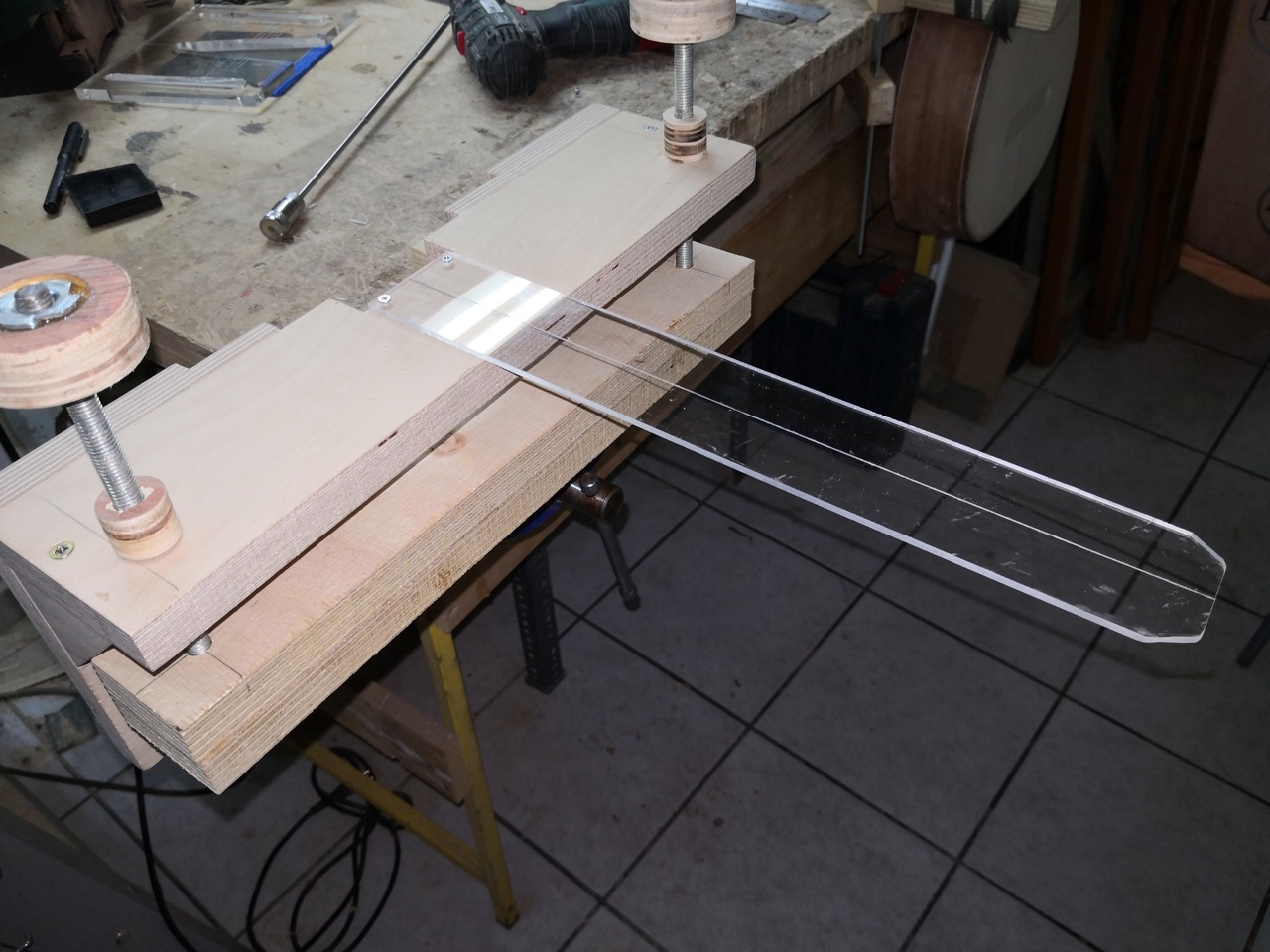 Έτσι αποφάσισα να αντικαταστήσω τα templates με πλεξιγκλάς 1cm που το έκοψα σε με laser σε ειδικό εργαστήριο. Ως σχέδιο χρησιμοποίησα εκείνο του βιβλίου "Κατασκευή λαϊκής κιθάρας - Θεωρία & Πράξη". Γρήγορα διαπίστωσα όμως ότι δεν ήταν κάτι απλό να βελτιώσω την παλαιά μου ιδιοκατασκευή, αλλά στην ουσία έπρεπε να την κατασκευάσω από την αρχή.