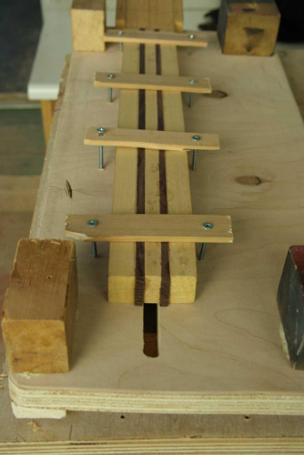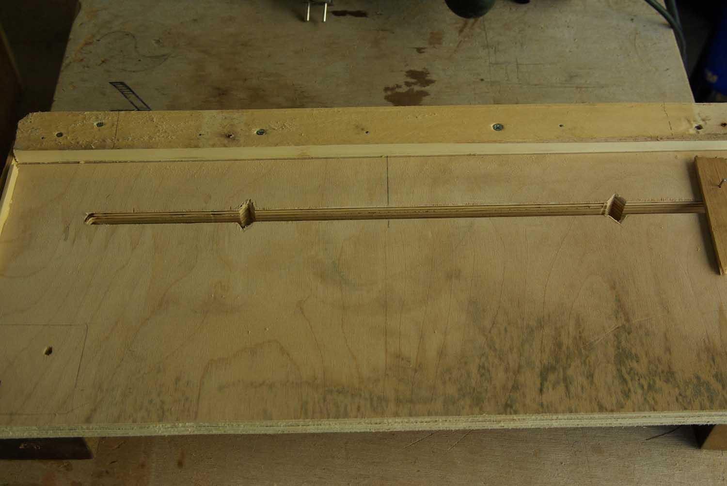 Κατ΄αρχήν μέ ένα κομμάτι κόντρα πλακέ 22χιλ μαγέθους περίπου 20χ60 εκ καί τέσσερα τακάκια 6χ6χ6 εκ φτιάχνουμε ένα " τραπεζάκι " . Στή μιά από τίς μεγάλες πλευρές κολλάμε μία πήχη 2χ6χ60 εκ πλανισμένη .