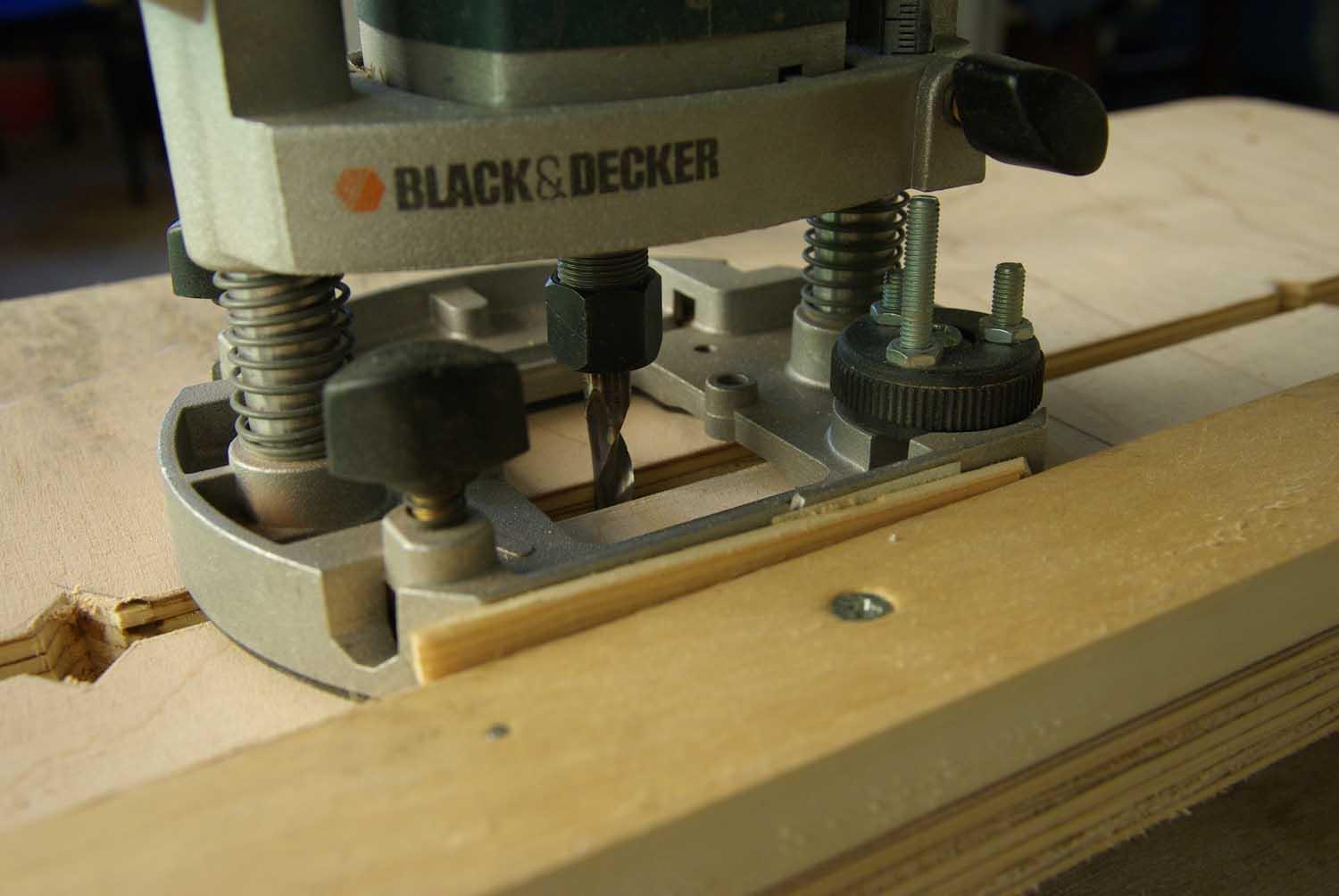 Στή συνέχεια , προσθέτουμε ένα τακάκι μέ πάχος όσο η διαφορά κοντύλι/τελικό επιθυμητό φάρδος γκινισιάς στό πέδιλο τού ρούτερ εκεί πού πατάει στήν πήχη / οδηγό . Στή δική μου περίπτωση 11 - 8 = 3χιλ