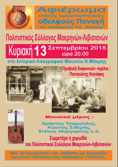Έτσι λοιπόν ο Πολιτιστικός Σύλλογος Μακρηνών-Λιβισιανών την Κυριακή 13/9 και ώρα 20:00 θα πραγματοποιήσει μια εκδήλωση για να τιμήσει τους παλαιούς οργανοποιούς Παναγήδες.