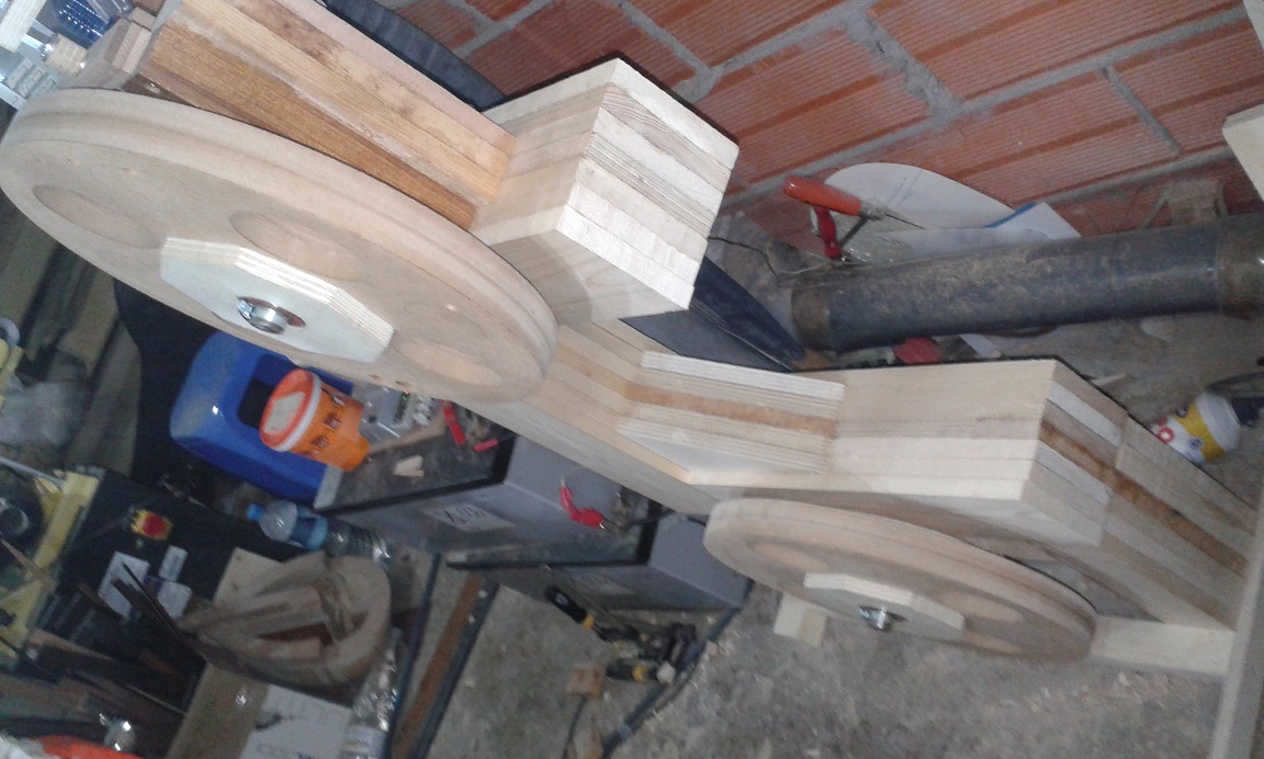Η κατασκευή μου όπως δείχνω και στις φωτογραφίες έχει προχωρήσει αρκετά, έγινε ο κορμός , οι τροχοί των 16 ιντσών , η ζυγοστάθμιση των τροχών, η ευθυγράμμιση των αξόνων των τροχών , και το σύστημα τάνυσης της πριονοταινίας. Η μηχανή θα έχει ηλεκτροκινητήρα 2 HP (1,5 KW)μονοφασικό για χρήση στο σπίτι, ύψος κοπής 27cm μέγιστο , και θα μου κοστίσει σε υλικά 250-270 ευρώ με έναν πρόχειρο υπολογισμό όπου περιλαμβάνεται καινούριος ηλεκτροκινητήρας . Το κοστολόγιο ήδη έχει φτάσει στο σημείο που βρίσκομαι στα 106 ευρώ (ρουλεμαν άξονας καλιμπρέ, ιμάντες και ξυλεία ήταν φτηνά), αλλα μια μηχανή στο εμπόριο με τέτοιες δυνατότητες έχει το λιγότερο ένα χιλιάρικο και ίσως και παραπάνω , έτσι η ιδέα της κατασκευής μου φάνηκε πολύ ελκυστική .