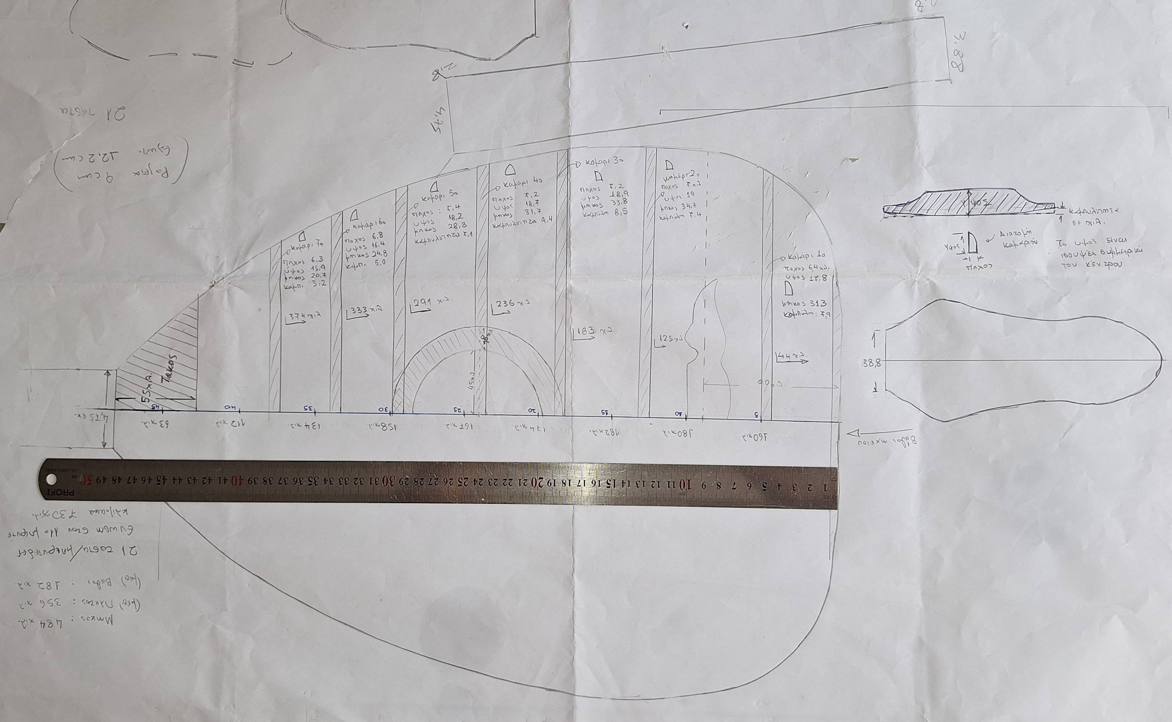 Μιας και έπεσε στα χέρια μου το λαούτο για μια δύσκολη επισκευή είπα να καταχωρήσω σε ξεχωριστό θέμα τις διαστάσεις του οργάνου και κάποια σχέδια που έφτιαξα.
