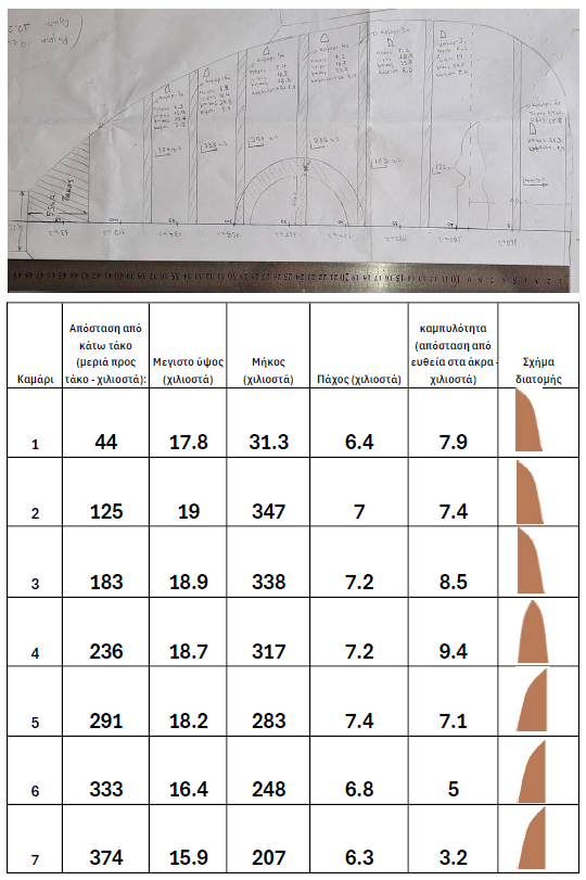 Στο άλλο μισό καταγράφονται οι ακριβείς θέσεις των καμαριών, οι διαστάσεις τους και η διατομή τους. Επίσης η θέση του καβαλάρη και της τρύπας.