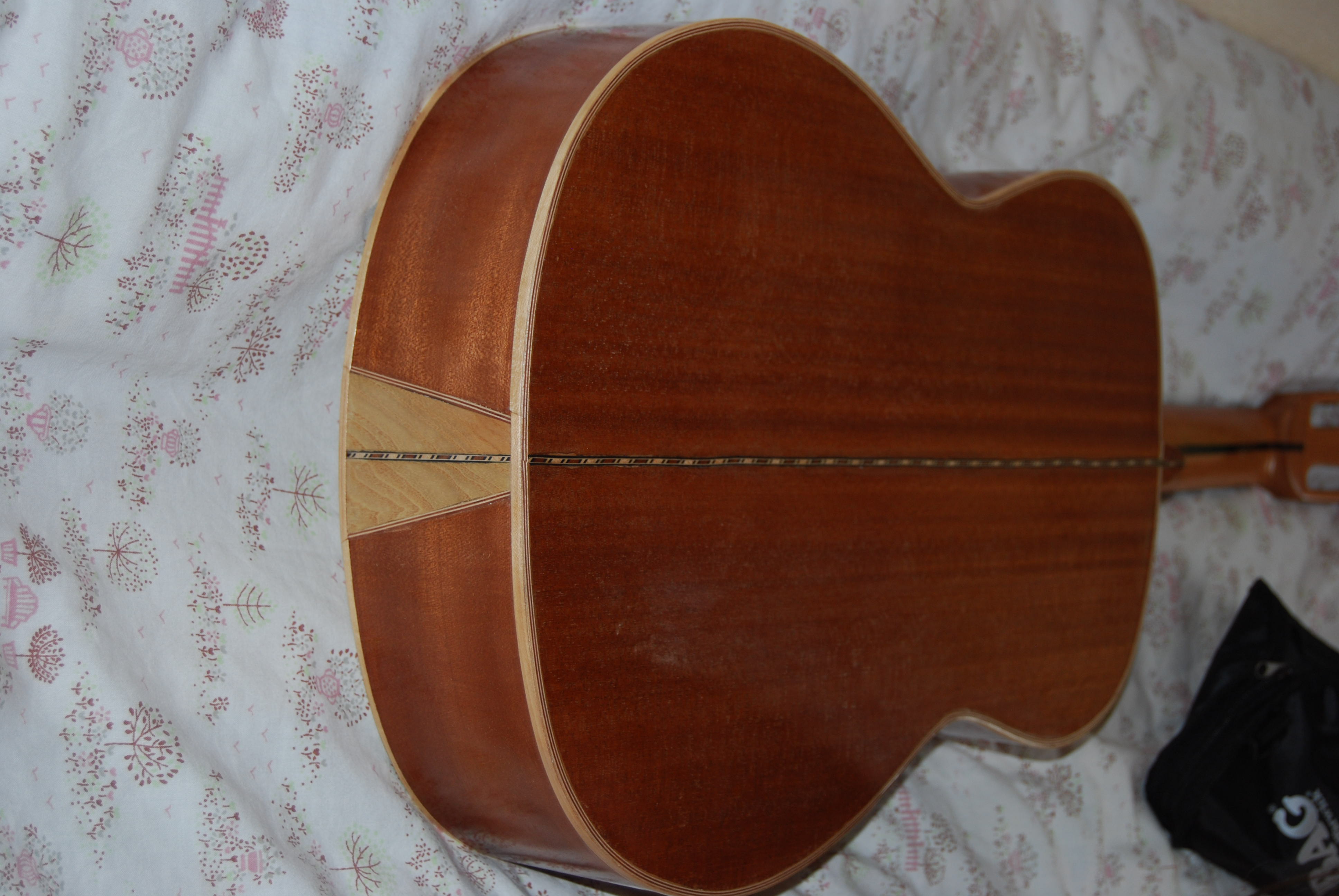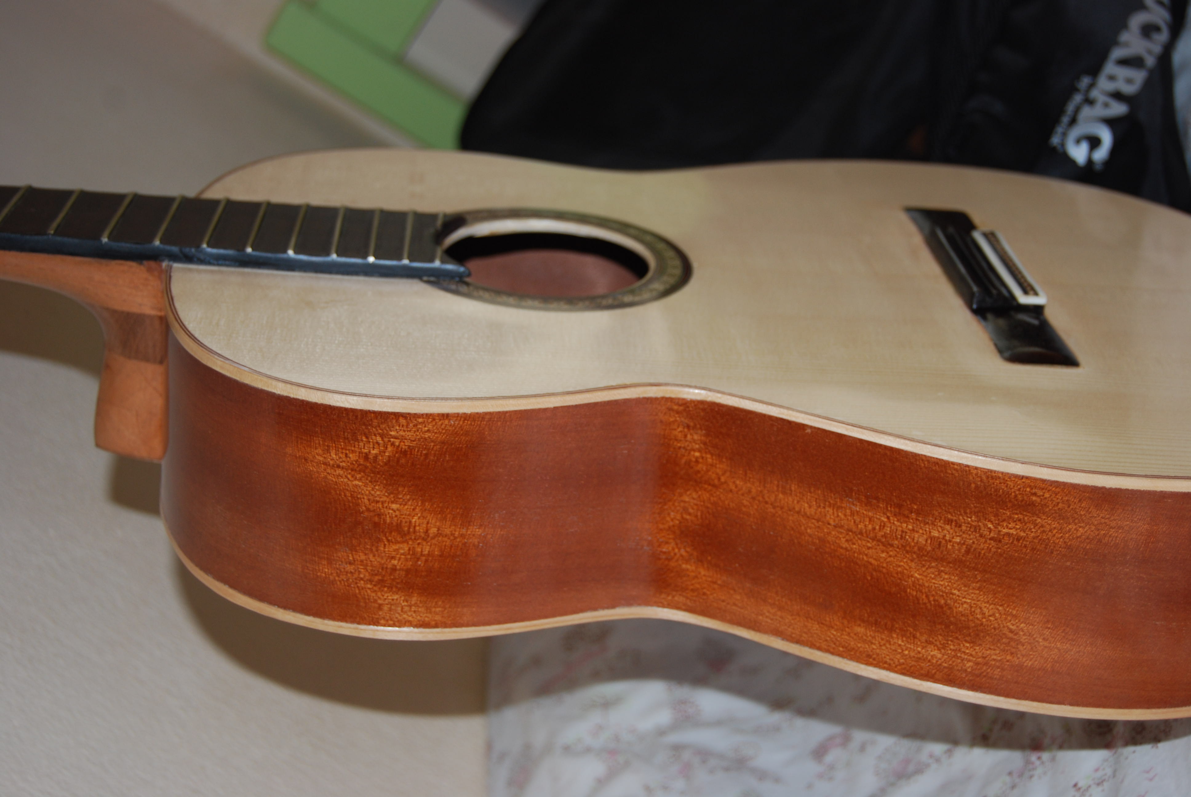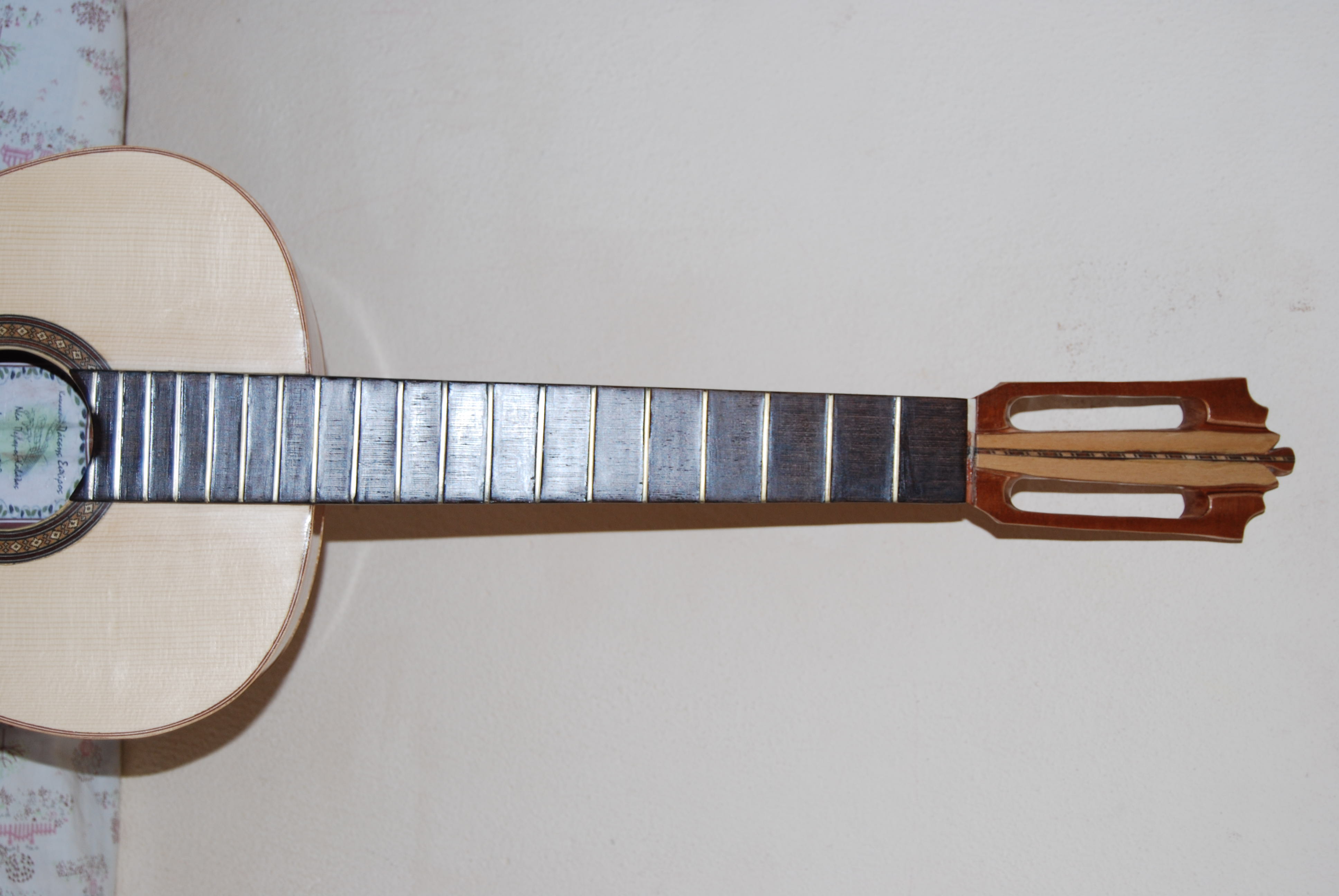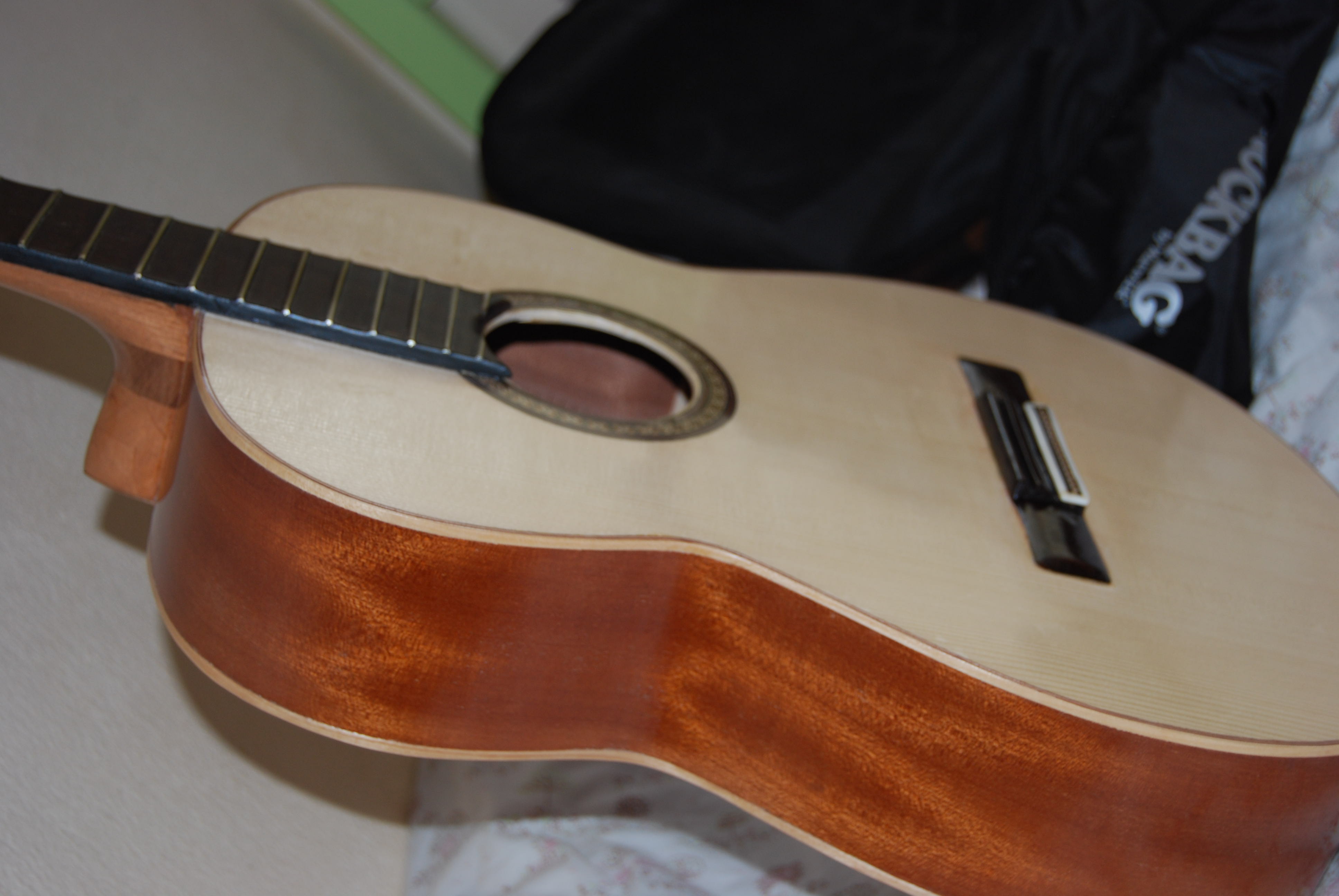 καλησπερα στους απανταχου ερασιτεχνες οργανοποιους και μη...μολις τελείωσα την βελτίωση της πρωτης μου κιθαρας .. κατεβασα σε υψος τον καβαλαρη, λέπτυνα το καπακι..ετριβα και ετριβα με γυαλόχαρτα μέρες..εκανα και καποιες αισθητικες παρεμβασεις στην κλειδιέρα και στα πλαινα..λου στάρισμα με γομαλάκα( παρεπιπτώντως την διέλυσα σε μετουσιωμενο οινόπνευμα 95 βαθμών που αγορασα από το φαρμακίο 2,5 ευρώ).και εχτεσ εβαλα τις παλιες χορδες και εμεινα έκπληκτος από την μετάλλαξη του οργανου...άλλο όργανο...ηχος δυνατόσ λαμπερός γλυκός...το θέμα είναι ότι ηχητικά υπερέχει της δευτερης κατασκευής που έχει καλύτερη ξυλεία...και με μπήκε το μικρόβιο να κάνω παρέμβαση και σε αυτή. Στέλνω κάποιες φωτο.....