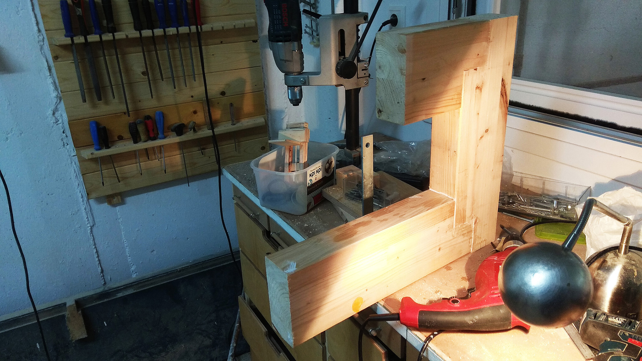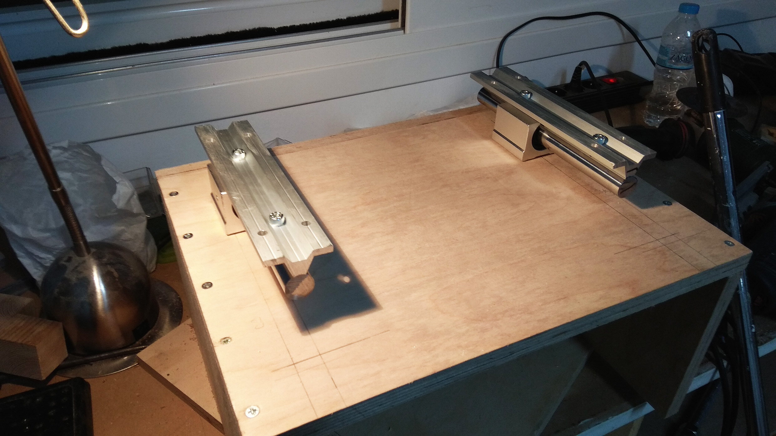 Ο σκελετός είναι ένα "Π" από σύνθετο πεύκο (πολλές λωρίδες ενωμένες) που περίσεψε από μια κατασκευή κεραμοσκεπής, κάποια κομμάτια (με μπλε λαδομπογιά) από ένα πρέκι μιας μεγάλης πόρτας που έγινε αλουμινένια και κάμποσο κόντρα πλακέ σημύδας. Μετά τις πρώτες δοκιμές όπου είδα τζόγο στην πλαινή διεύθυνση, πρόσθεσα και οδηγούς τηλεσκοπικούς συρταριών και πλέον ο τζόγος εκμηδενίστηκε. Τώρα που το σκέφτομαι, θα μπορούσαν να μπουνε τέτοιοι οδηγοί στη θέση των γραμμικών με τις ράγες με ασύγκριτα μικρότερο κόστος. (4 ευρώ το ζευγάρι έναντι καμιάς 50αριάς).