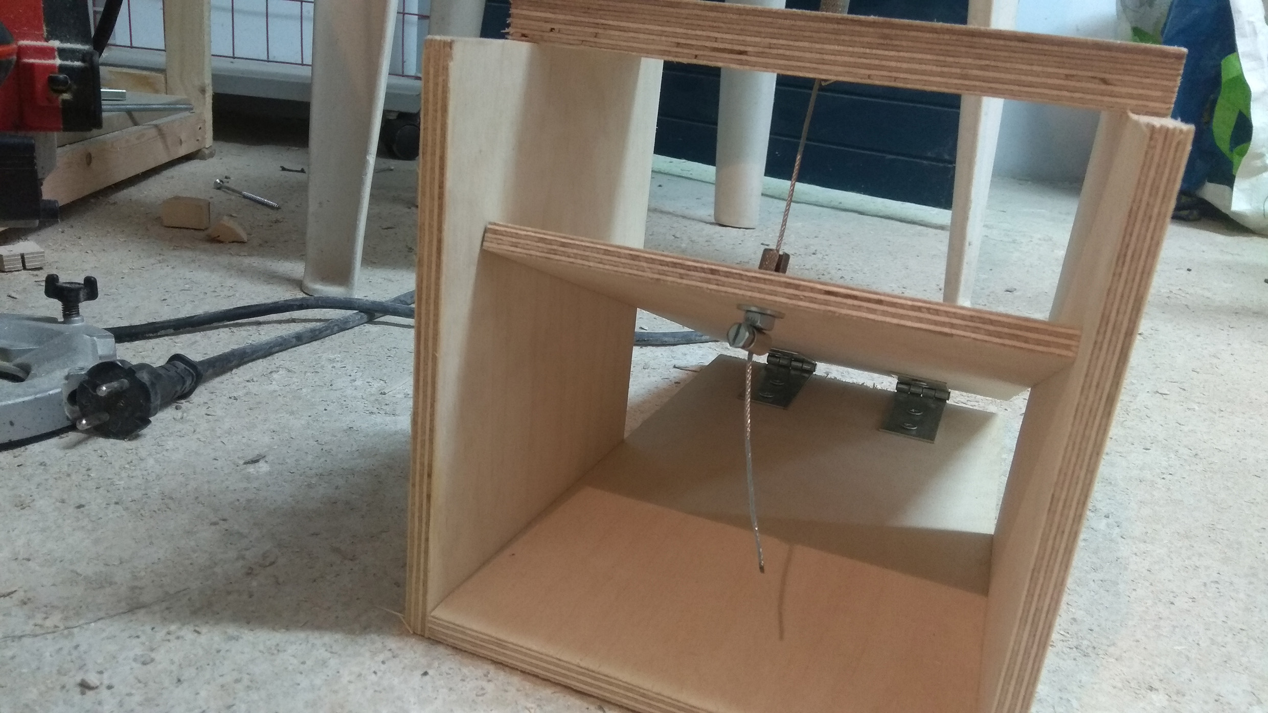 Το όλο σύστημα ήθελα να είναι κινούμενο με το πόδι ώστε να μπορώ να πιάνω το κομμάτι που δουλεύω και με τα 2 χέρια. Αφού δεν "αντέχουμε" προς το παρόν υδραυλικά συστήματα, κατασκευάστηκε "ποδοδιακόπτης" που στην ουσία είναι ένα κοντραπλακέ με μεντεσέδες που τραβάει μία γερή ντίζα ποδηλάτου με το περίβλημα-σωλήνα της. Ακινητοποιόντας τις άκρες του σωλήνα σε σταθερά σημεία, μία άκρη στο πόδι και μία στο μηχάνημα, έχω τη δυνατότητα να κουνάω τον ποδοδιακόπτη χωρίς να αλλάζει η διαδρομή της ντίζας. Με τα σωστά αντίβαρα (έκανα δοκιμές και με βάρη καταδύσεων και δεεεν) το πάτημα είναι απαλό και ομαλό χωρίς κλοτσήματα. Το μόνο θέμα που έχω είναι ότι δε μπορώ με το πόδι να ανεβάζω το ρούτερ όταν τελειώνει η δουλειά του και μέχρι να σκεφτώ κάτι (εγώ,εσείς... :o ) ανεβάζω όλο το "βαγόνι" με το χέρι.