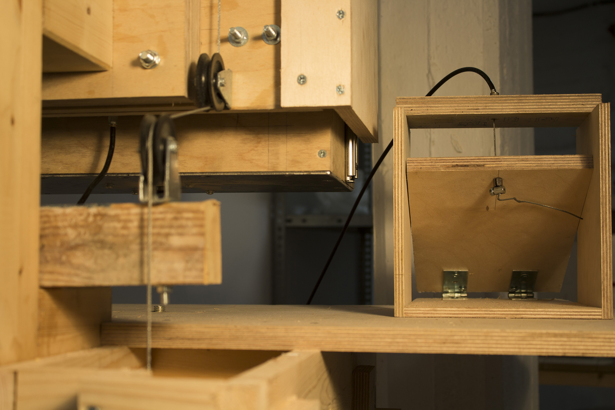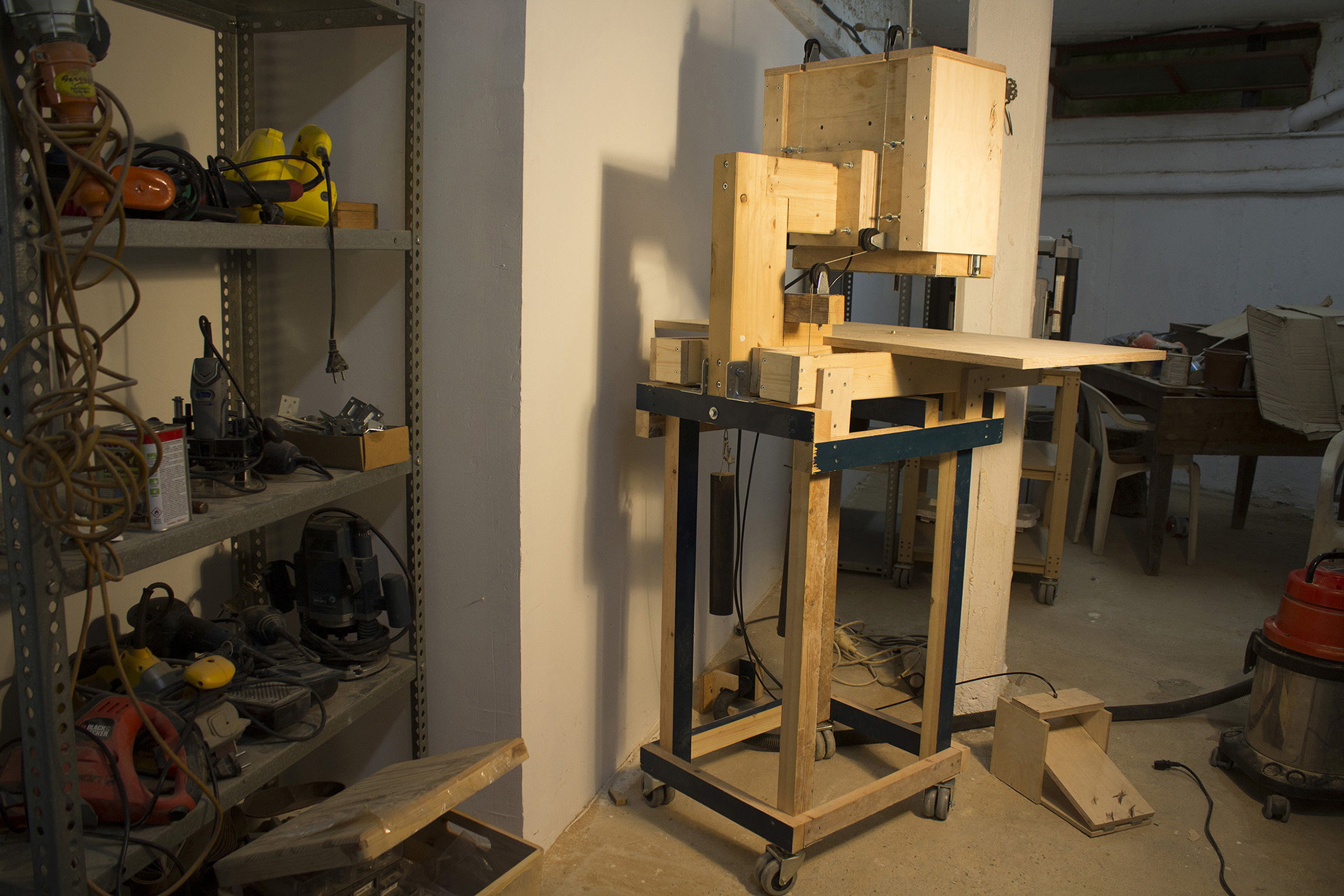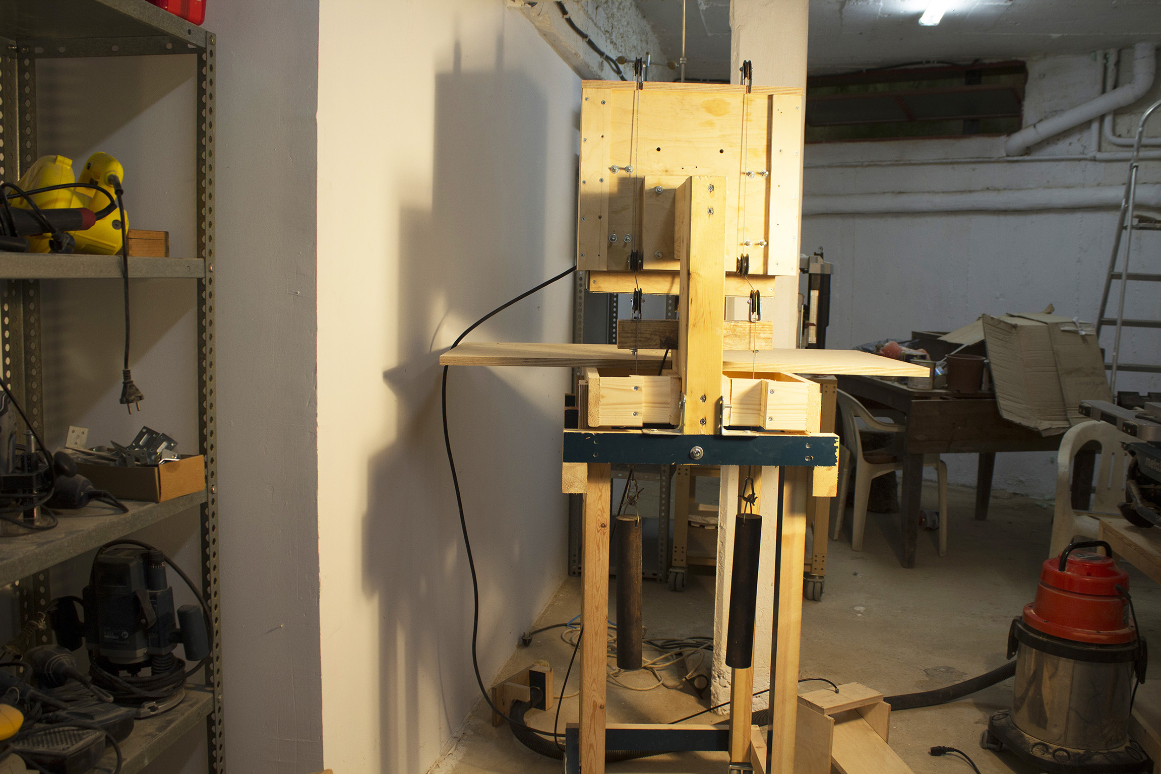 Αφού κατασκευάστηκε το "βαγόνι" με λαμαρίνα 3 χιλιοστών στον πάτο και μπήκε το ρούτερ πάνω, ζυγίστηκε (περίπου 10 κιλά όλα μαζί) και μπήκαν αντίβαρα (2χ5 κιλά) στο πίσω μέρος ώστε να είναι ομαλή η κίνηση χωρίς μεγάλο έργο. Κάτι αντίστοιχο (χοντρά-χοντρά) με τη λειτουργεία των ασανσέρ. Τα αντίβαρα είναι μασίφ σωλήνες σίδερο οι οποίοι γνωρίζοντας το βάρος ανα μέτρο κόβονται στο επιθημητό μήκος (περί τα 30 εκ.), δένονται σε συρματόσχοινα (3χιλ) και προσαρμόζονται στην κατασκευή με ράουλα στις κατάλληλες θέσεις.