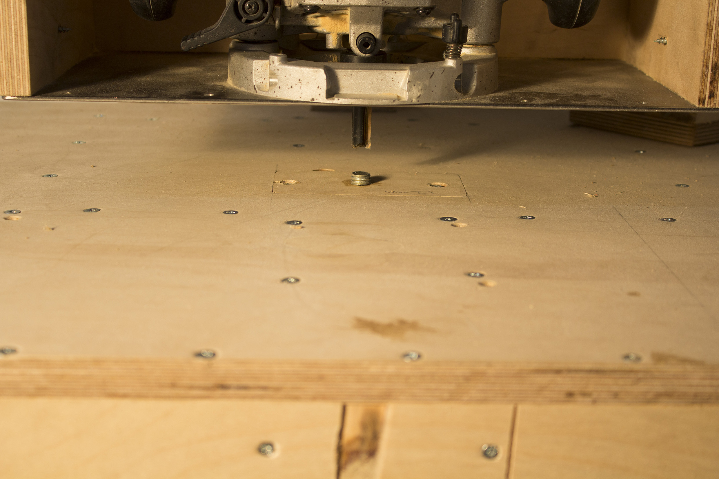 Τέλος η επιφάνεια εργασίας αλφαδιάστηκε με μαζοχιστική ακρίβεια ώστε να είναι εντελώς κάθετη στο κοπτικό του ρούτερ και κατασκευάστηκαν ένθετα κομμάτια με τους οδηγούς-pins από ντίζες ίδιας διαμέτου με τα κοπτικά που έχω. Μπορώ να παίξω με τις διαμέτρους και να βάλω χονδρότερο κοπτικό σε σχέση με τον οδηγό και να κάνω και κανάλια για binding. Κάποια στιγμή πρέπει να δοκιμάσω και αυτά τα spiral κοπτικά που βλέπω ότι χρησιμοποιούνται κατά κόρον στα cnc μηχανήματα. Λίγο αλμυρά βέβαια σε τιμή...