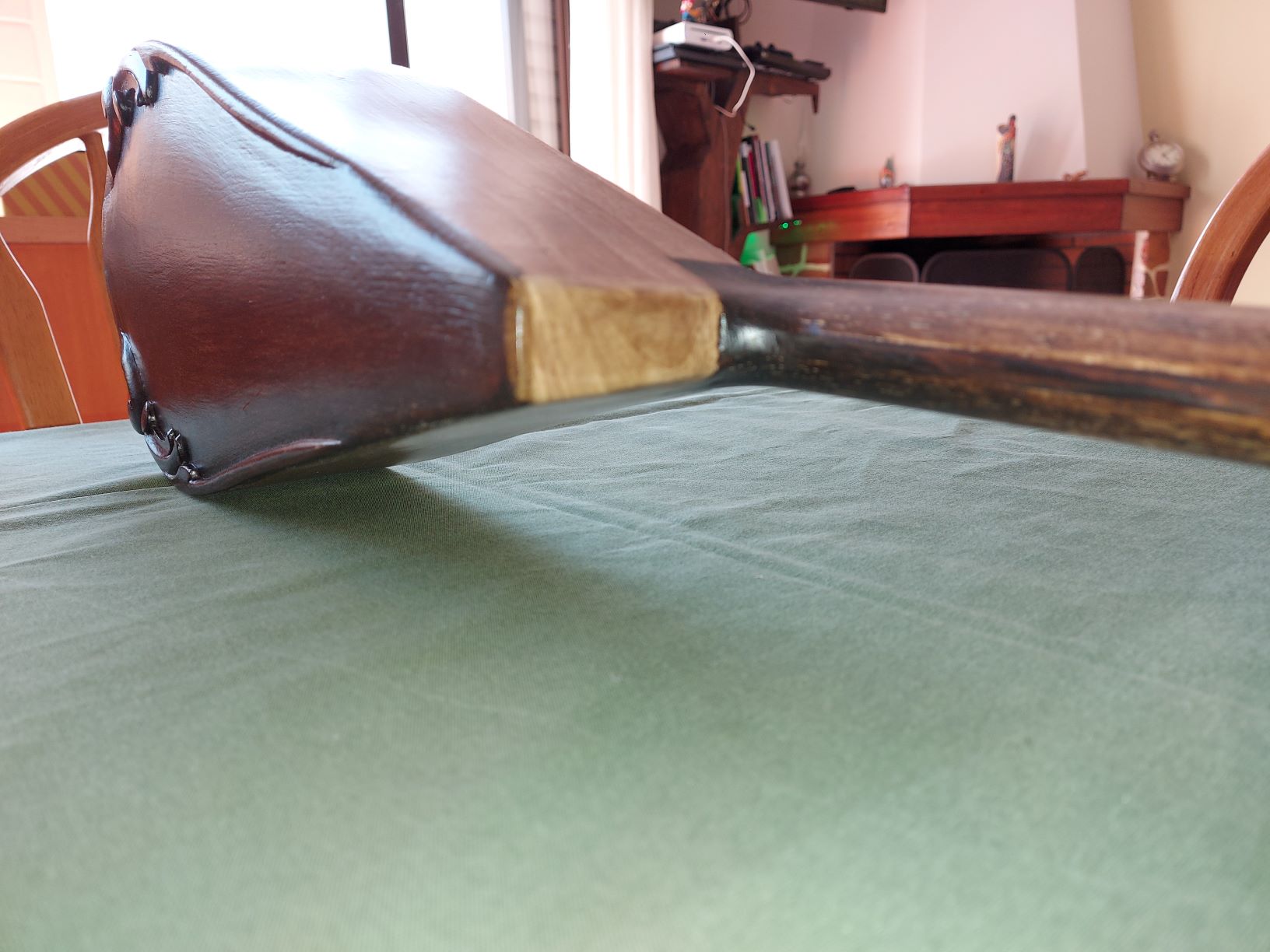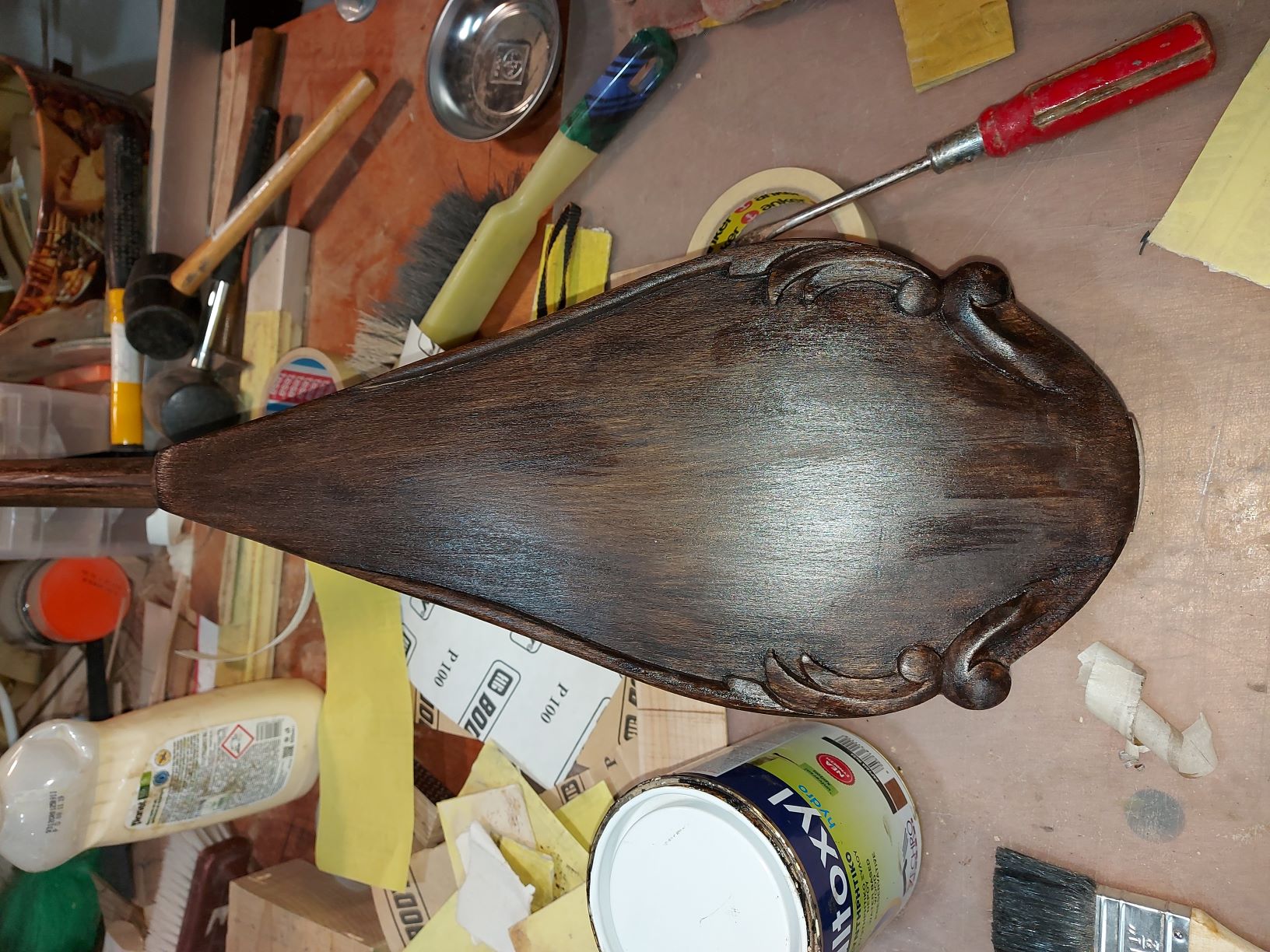 Το αποτέλεσμα αποτέλεσμα με το εμποτισμού είναι συζητήσιμο.Τώρα θα ακολουθήσει τρίψιμο με 400αρι και εφαρμογή ενός ματ υδατοδιάλυτου βερνικιού (ευγενική χορηγία του Στέλιου).Πιστεύω πως το αποτέλεσμα θα κρατήσει την αίσθηση του παλιού, για αυτό και επιλέχθηκε. Άσε που θα κρύψει και τις ατέλειες μιας και λόγω των σκαλισμάτων δεν είναι εύκολη η προετοιμασία της επιφάνειας.Το μάνικο είναι καστανιά και παρόλο που μου άρεσε πολυ το αποτέλεσμα του χωρίς εμποτισμού το έβαψα και αυτό για την ομοιομορφία με το καράολο που έχει και σκάλισμα και αυτό.Το μόνο που δεν θα περαστεί το ματ βερνίκι είναι το καπάκι που θα περαστεί γομαλάκα.   Στο καπάκι περάστηκε μόνο το σκάλισμα με βερνίκι εμποτισμού με πινελάκι και λερώθηκε λίγο το καπάκι, μα θα τριφτεί να καθαρίσει πριν περαστεί η γομαλάκα. Ούτως ή αλλως σκέφτομαι να προσθέσω κάτι ακόμα στο καπάκι πριν τη γομαλάκα.