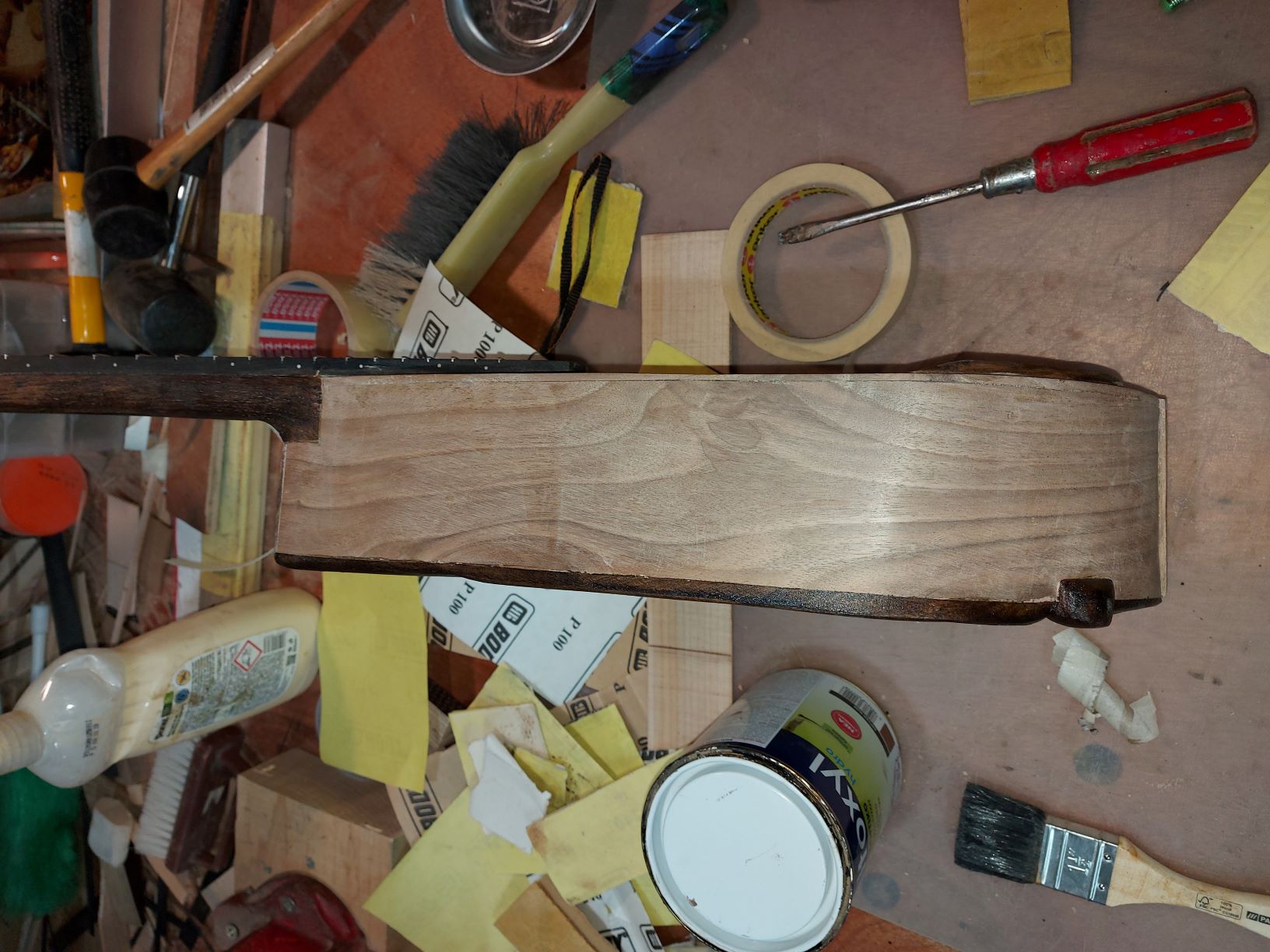 Έτσι, πέρασα ένα βερνίκι εμποτισμού σκούρα καρυδιά -υδατοδιάλυτο φαίνεται σε κάποια φωτογραφία.