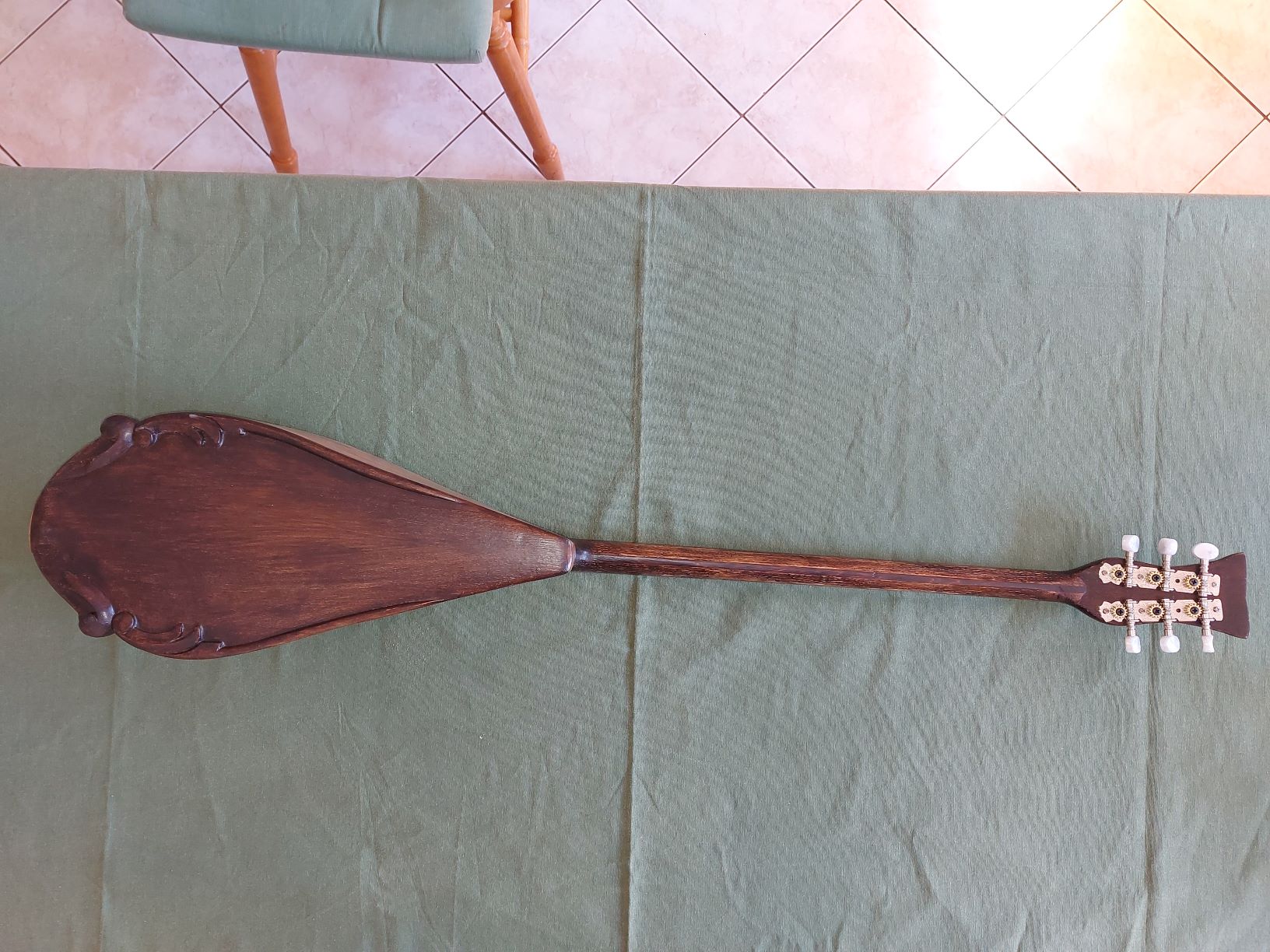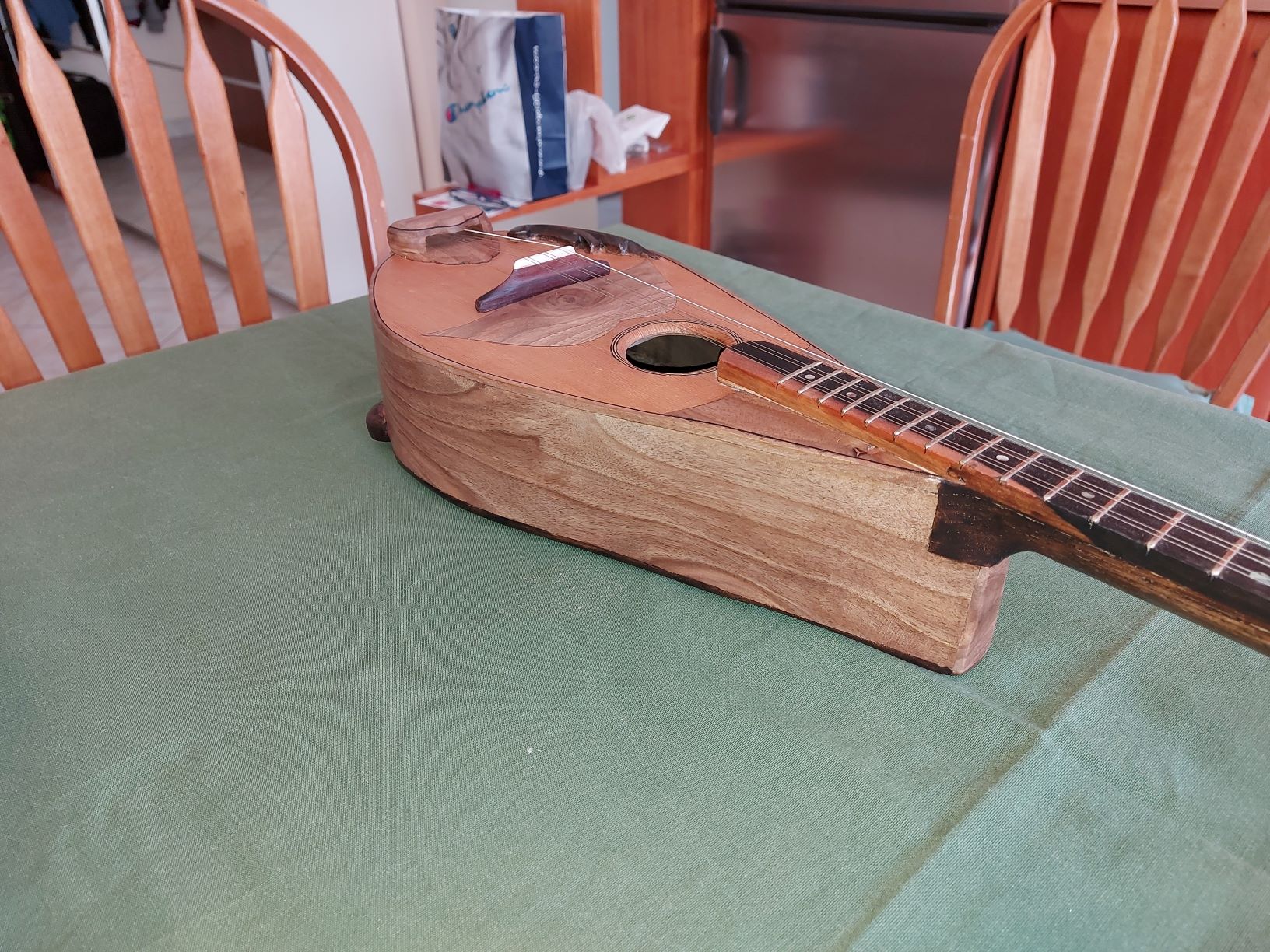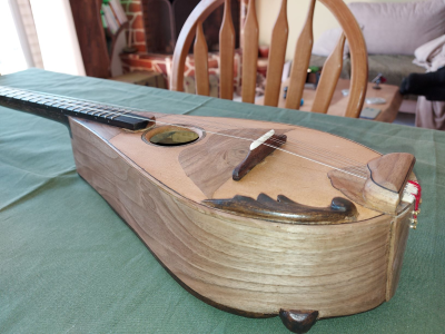 Το όργανο αυτό θα το ονόμαζα είτε μισομπούζουκο είτε τζουρά μιας και έχει σκάφος μεγαλύτερο από τζουρά και μικρότερο από μπουζούκι. Το σχήμα του οργάνου δεν είναι απόλυτα συμμετρικό μιας και ακολουθεί το αρχικό σχήμα της καρέκλας και δεν θέλησα να επέμβω σε αυτό.