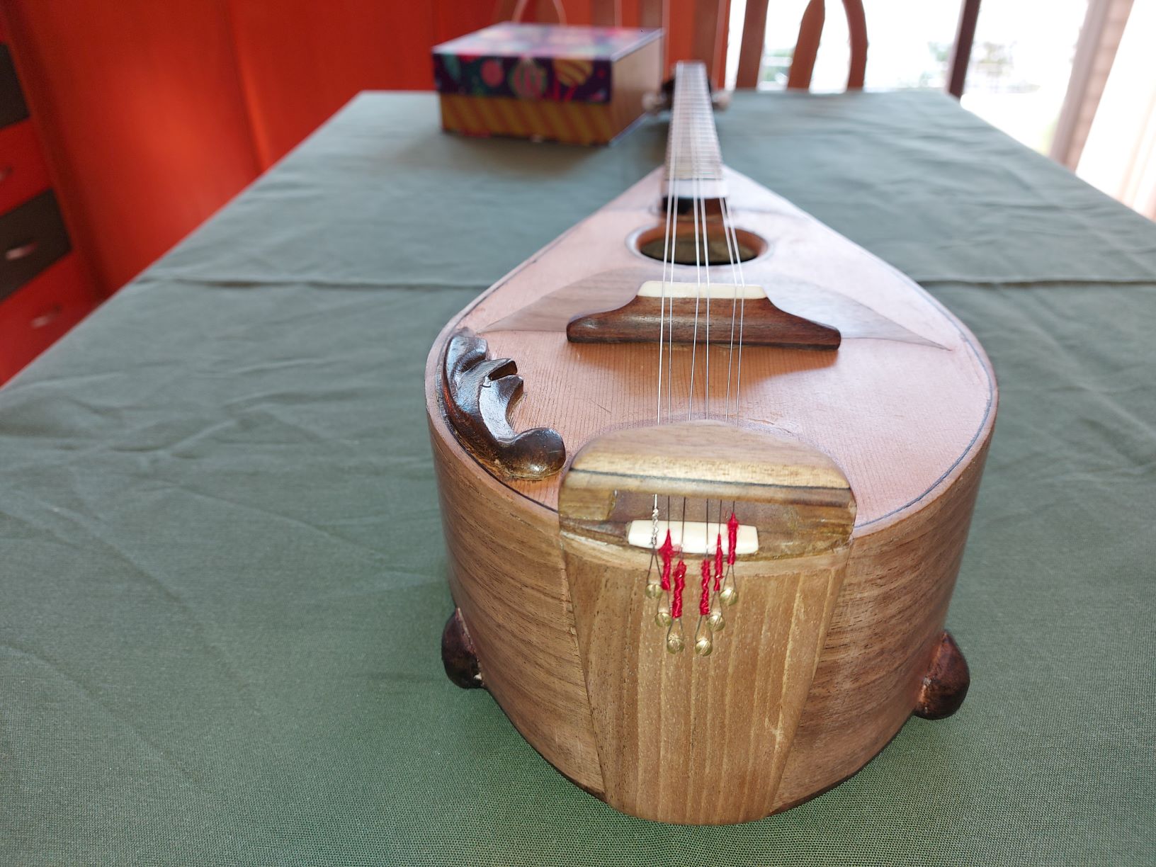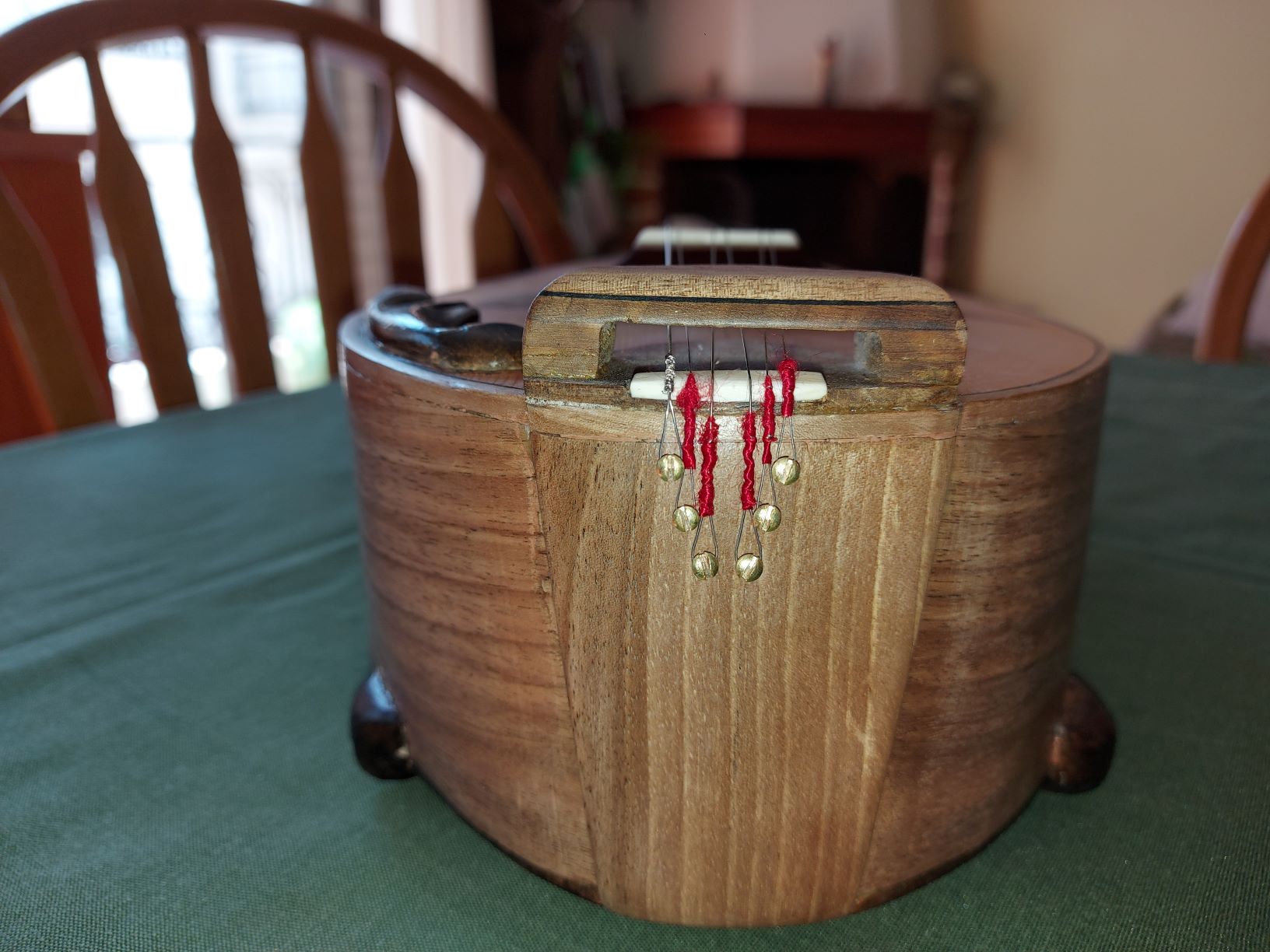 Η ιδέα ξεκίνησε όπως και με άλλο ένα όργανο να κατασκευαστεί ένα όργανο ανακυκλώνοντας παλιά σκαλιστά ξύλα από έπιπλα. Το ενδιαφέρον για μένα ήτανε να περισώσω τη δουλειά ενός καλλιτέχνη που σκάλισε τα ξύλα στο χέρι και να μην καταλήξει ο κόπος του σε κανά τζάκι. Τα κομμάτια αυτά τα περιμάζεψα από  τραπεζαρία σπασμένη και πεταμένη στα σκουπίδια πριν κάμποσα χρόνια.