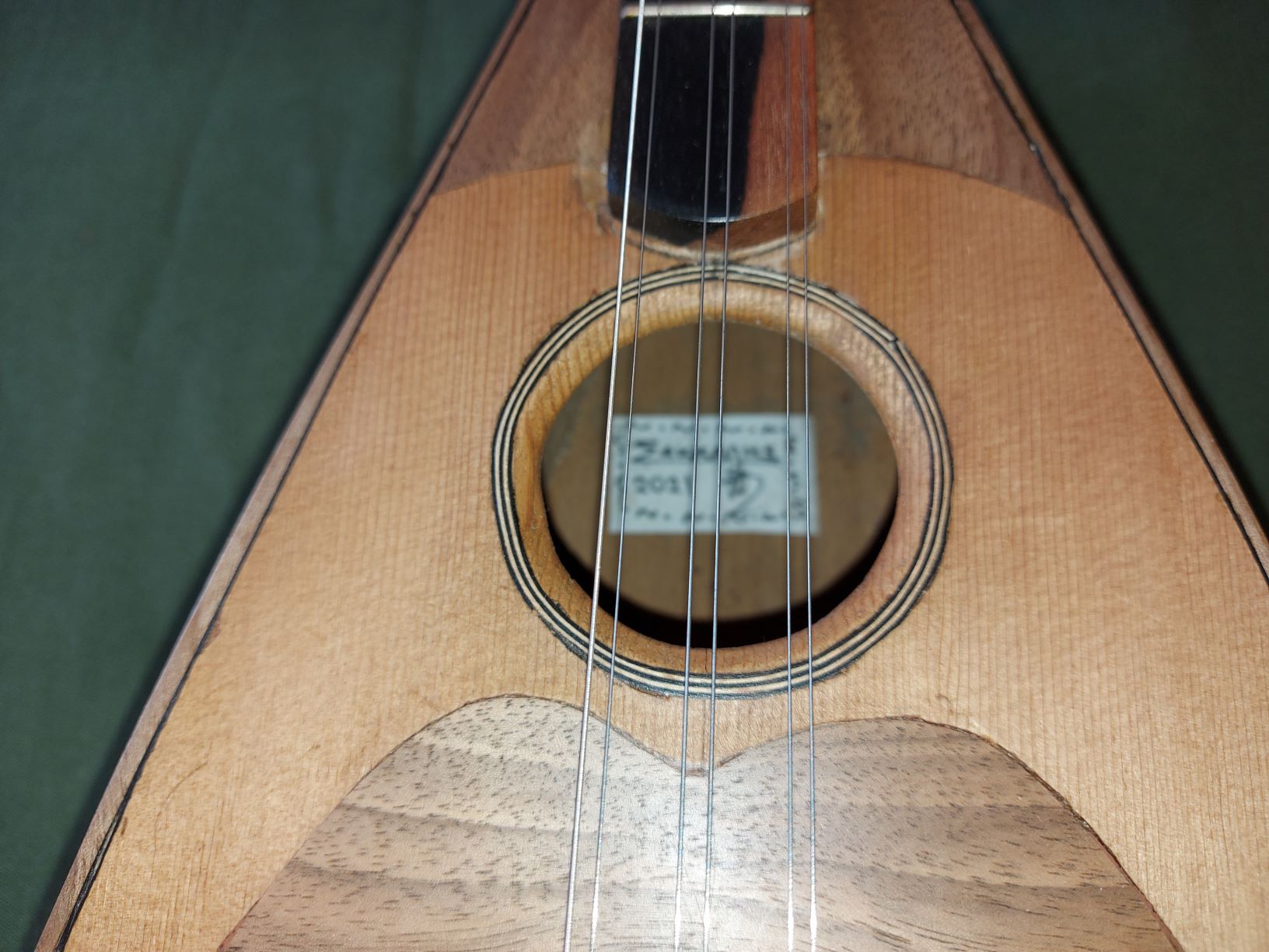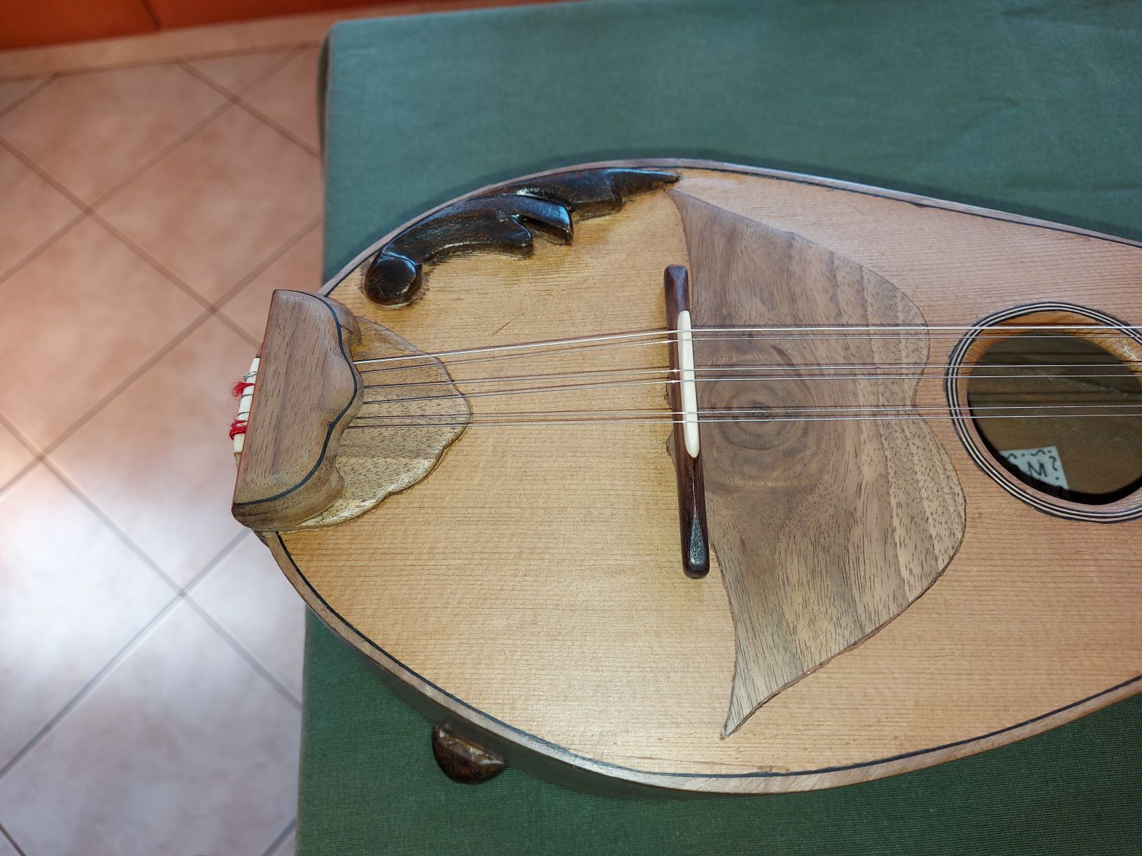 Η χορδιέρα είναι ιδιοκατασκευή από ελληνική καρυδιά και οι χορδές πιάνουν σε μπρούτζινα βιδάκια. Πιστεύω πως μία απλή μεταλλική χορδιέρα δεν θα έδενε με την όλη μπαρόκ (sic) εμφάνιση.