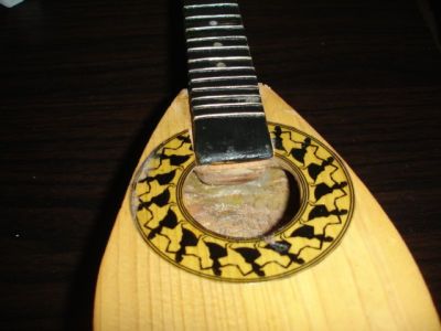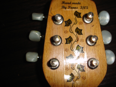 Ευτυχώς σφηνώσανε πολύ καλά, έκοψα τα περισσεύματα και έκανα ένα απλό λιμάρισμα για να τα επιπεδώσω. Έβαλα και τους τσαμπουκάδες, ψιλές ξύλινες καβίλιες, δεν είχα ειδικά υλικά, ούτε καν χοντρή ασετόπαστα. Αφού τελείωσαν όλες οι απαραίτητες εργασίες, τρίβω με ψιλό γυαλόχαρτο τον μπαγλαμά και τον βάφω με ένα έγχρωμο βερνίκι καρυδιάς 3-4 χέρια. Ήταν σχεδόν έτοιμος, βρισκόμουν πολύ κοντά στο όνειρο μου, τον αφήνω 15 περίπου μέρες να στεγνώσει καλά και μετά ο τρελός τι έκατσα και έκανα;  ;D… επειδή δεν είχε την παραμικρή φιγούρα επάνω, ούτε καν φιλετάκια περιμετρικά στο καπάκι, έκατσα και ζωγράφισα στο καπάκι λουλουδάκια και φυλλωσιές. Του βάζω και τα κλειδιά του, τον καβαλάρη, το κόκαλο και την χορδιέρα και τον αρματώνω. Μόλις άκουσα να βγάζει ήχο ένοιωσα υπέροχα :-*, δε μπορούσα να πιστέψω πως από αυτό το άλλοτε κομμάτι οξιάς θα μπορούσε να βγει μελωδία.