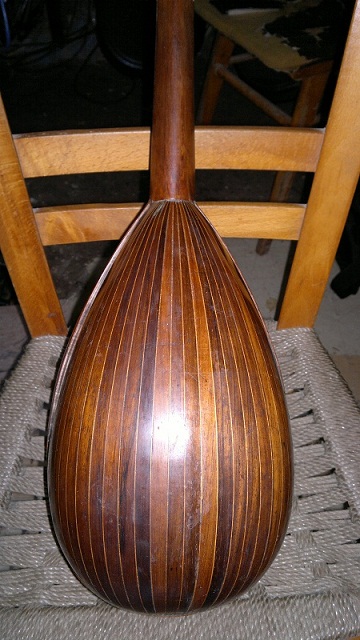 η κατασκευή του είναι πάρα πολύ προσεγμένη. Το σκάφος είναι από παλίσσανδρο με πολύ συμμετρικές και καλοδουλεμένες ντούγιες, το κορδόνι του καπακιού είναι από σεντέφια πάχους 2,5-3 χιλ. και πολύ περισσότερο αυτό που προαναφέρω ότι δεν έχω ξαναδεί τέτοια εφαρμογή σε φιγούρα τόσο παλιού οργάνου. Θα μπορούσα να την χαρακτηρίσω