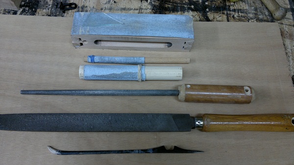 Εργαλεία που χρησιμοποιήθηκαν : Μια ράσπα ίσια και μια στρόγγυλη με μεσαίο δόντι και οι δύο, ένας τάκος ίσιος, ένας τάκος κυλινδρικός Φ26 (από κουρτινόξυλο), ένας τάκος κυλινδρικός Φ12 (από καβίλια Φ12 με το μέτρο) όλοι "ντυμένοι" με γυαλόχαρτο 100άρι, πριονοκορδέλα ή πριόνι οργανοποιίας, ένα κομμάτι γυαλί και γυαλόχαρτα Φ80 και Φ150.