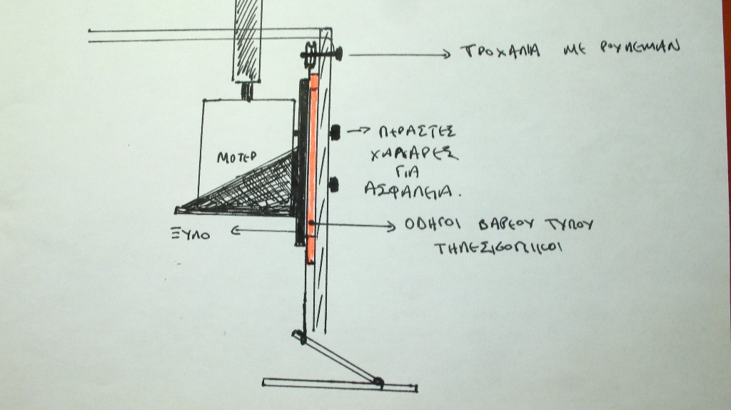 Ευχαριστω επισης και για το σχεδιο! Αυτο που σκεφτομουν να κανω με το μοτερ με μειωτηρα ειναι το εξης: Θα προσαρμοσω το υπαρχον μοτερ σε γραμμικα ρουλεμαν (οδηγους) για ομαλη και καθετη κινηση. Απο κατω θα τοποθετησω το μοτερ με μειωτηρα με εναν απλο στροφαλο κατασκευασμενο απο MDF, ο οποιος θα δινει την κινηση πανω κατω.