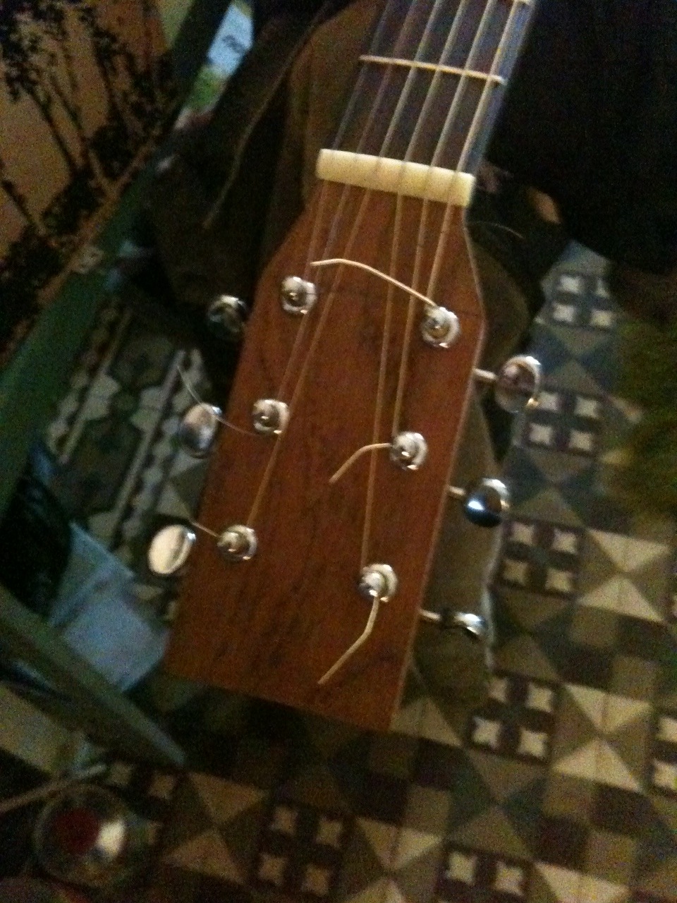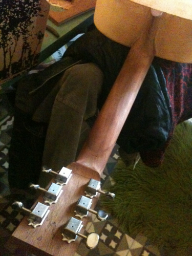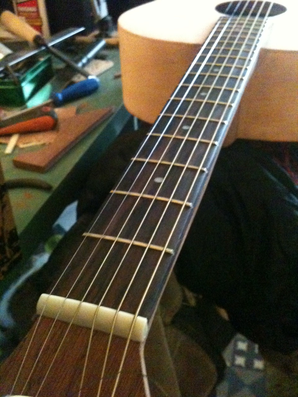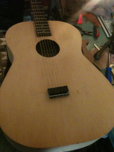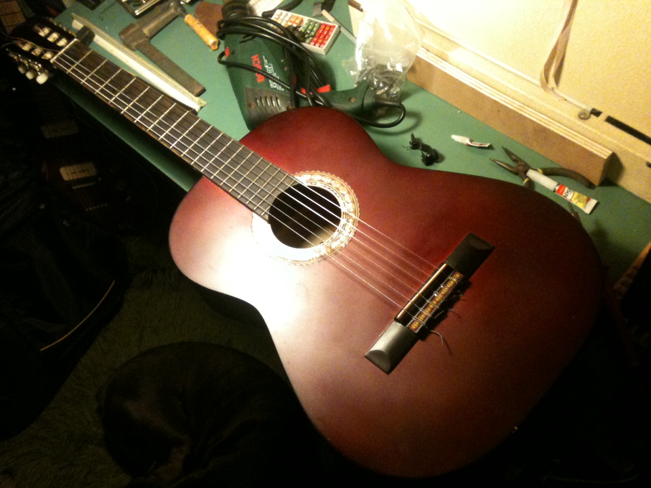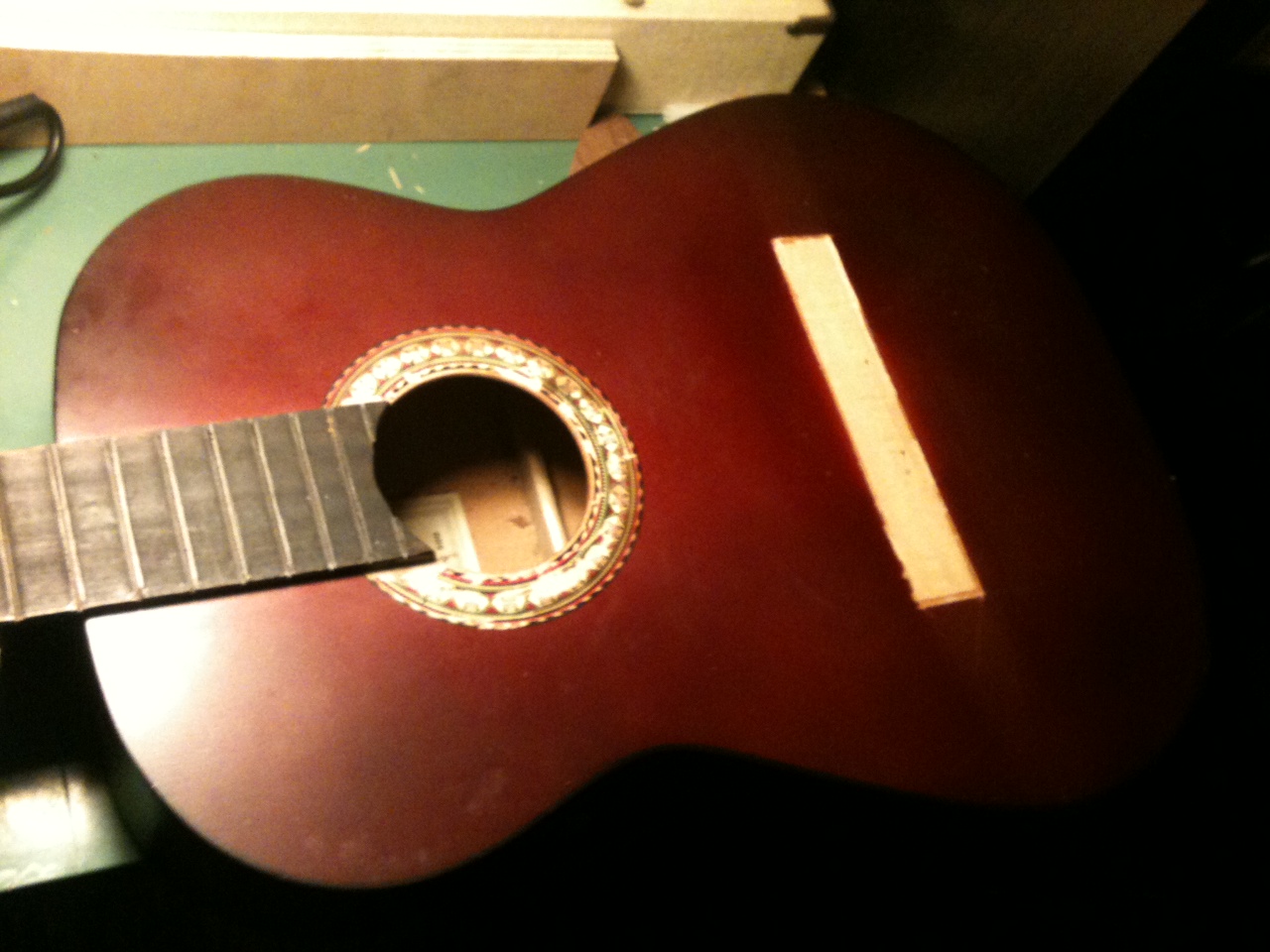 Η "μετατροπη" τελειωσε...το αποτελεσμα ειναι παραπανω απο αξιοπρεπες υπο την εννοια του οτι παιζει σωστα....μεχρι εκει... ;D...το "οργανο" ηταν πολυ χαμηλης ποιοτητας για να ασχοληθω να την κανω "τσιλικη"...οποτε την τελειωσα με οτι ειχα στο εργαστηριο απο παλια κλειδια και γεφυρα...ουτε φινιρισμα ουτε βερνικια...εφτιαξα ενα τακο για να μπει η γεφυρα απο κατω χωρις να χαλασω τα καμαρια κι ολα καλα...ακομα και τα ταστα που εβαλα ηταν απο οταν ηταν "κλασσικη"...μπρουτζινα...η μονη "αλλαγη" που θα κανω θα ειναι το "κοκκαλο" που θα βαλω επισης μπρουτζινο...αυτο που μου κανει εντυπωση και θελω τα φωτα σας, ειναι οτι ειναι εξαιρετικα "φωνακλου" (δεν λεω οτι εχει τρομερη ποιοτητα ηχου)...που οφειλεται αυτο???...η ουσια ειναι οτι θα εχω κιθαρα για το καλοκαιρι να χω να γρατζουναω, μιας και θα παω για δουλεια στη Σαμοθρακη... ;D ;D ;D